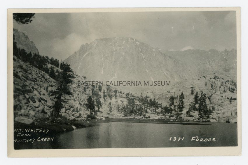 Photo postcard titled, "Mt. Whitney from Whitney Creek." It was taken by A. A. Forbes and given his photo ID #1351. There is a lake in the foreground.