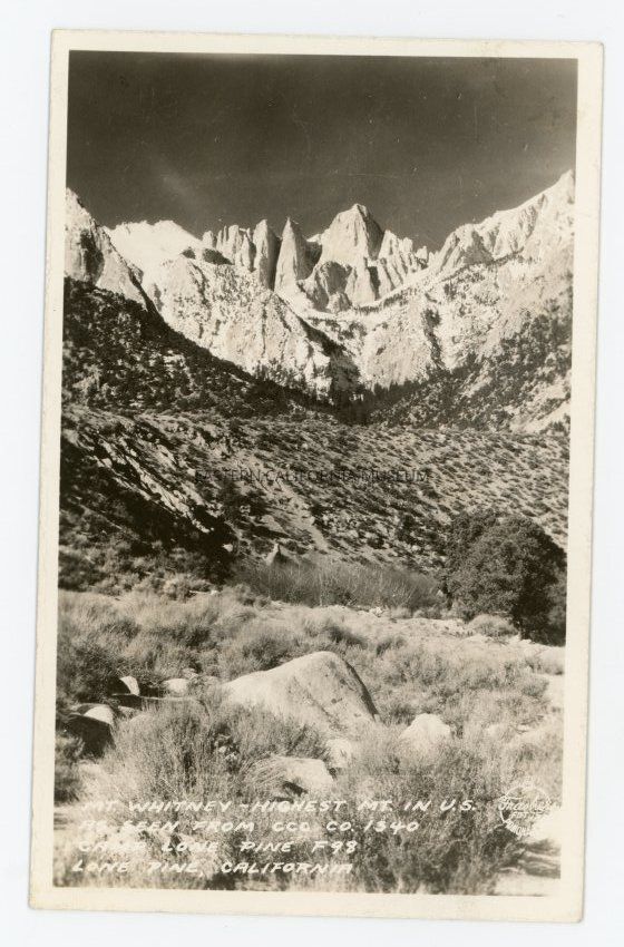Photo postcard titled, "Mt. Whitney, Highest Mt. in U.S. as seen from CCC Co. 1340 Camp Lone Pine F98, Lone Pine, California."