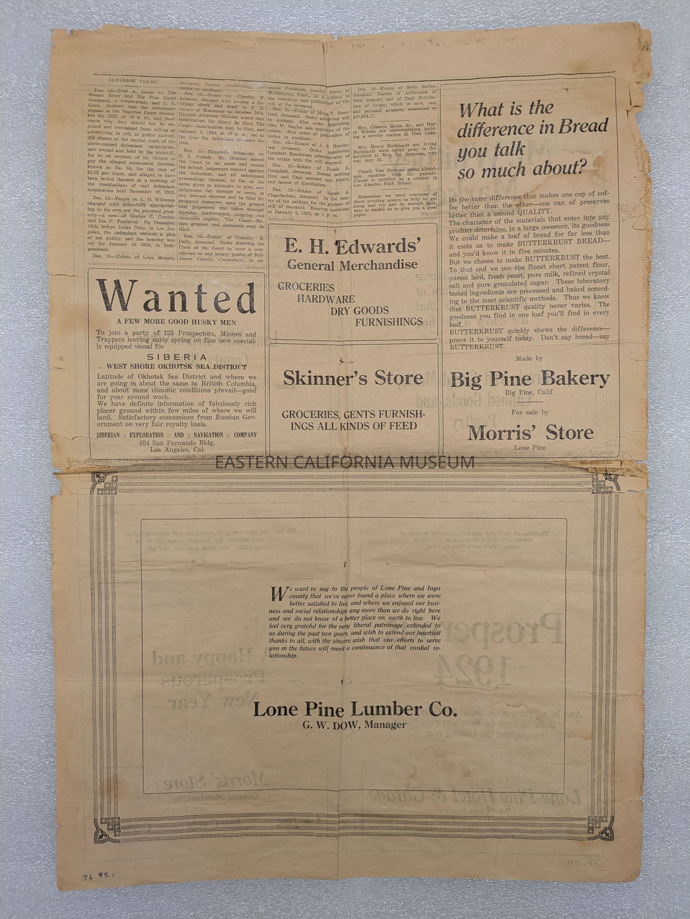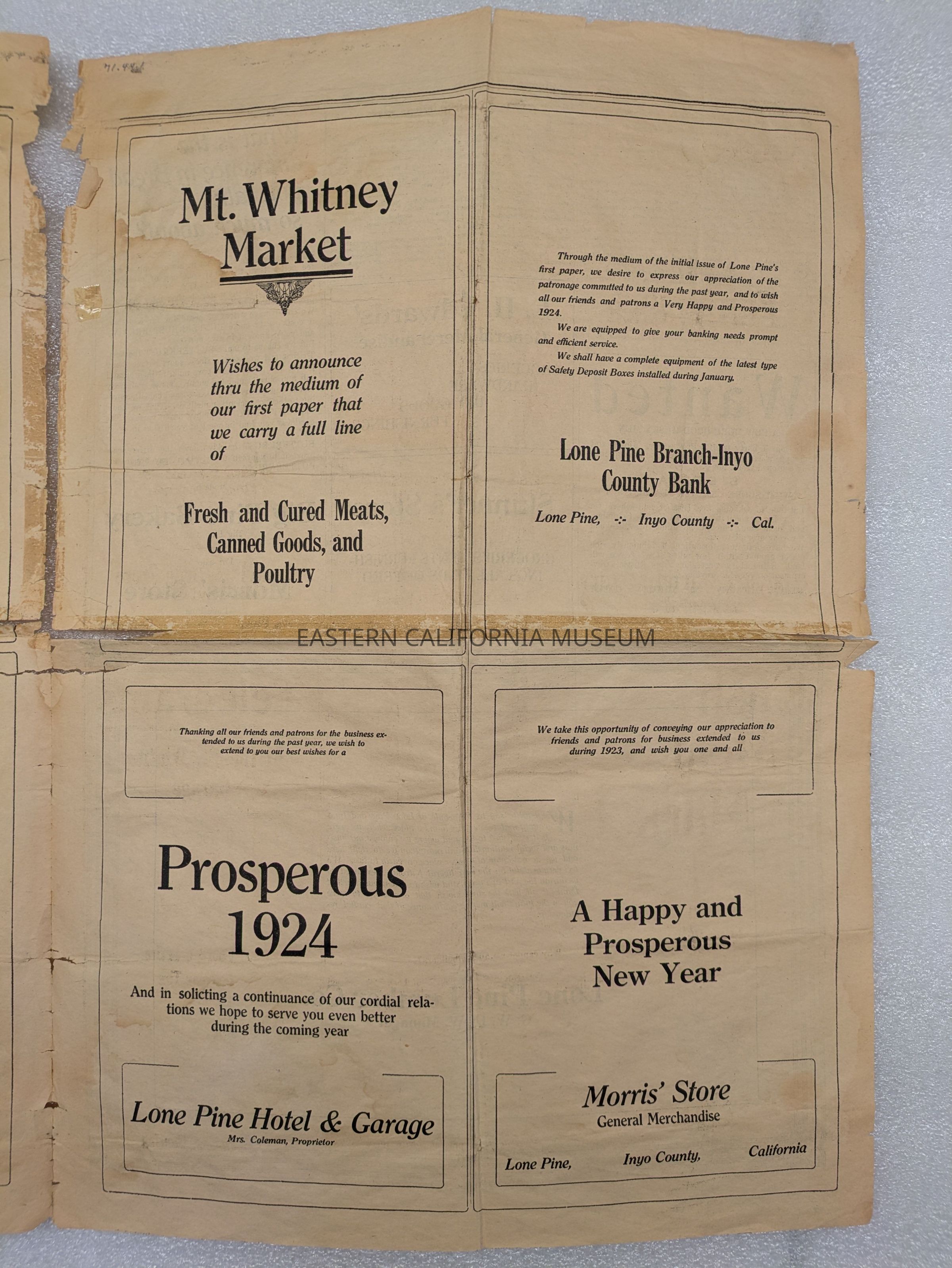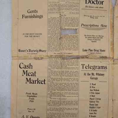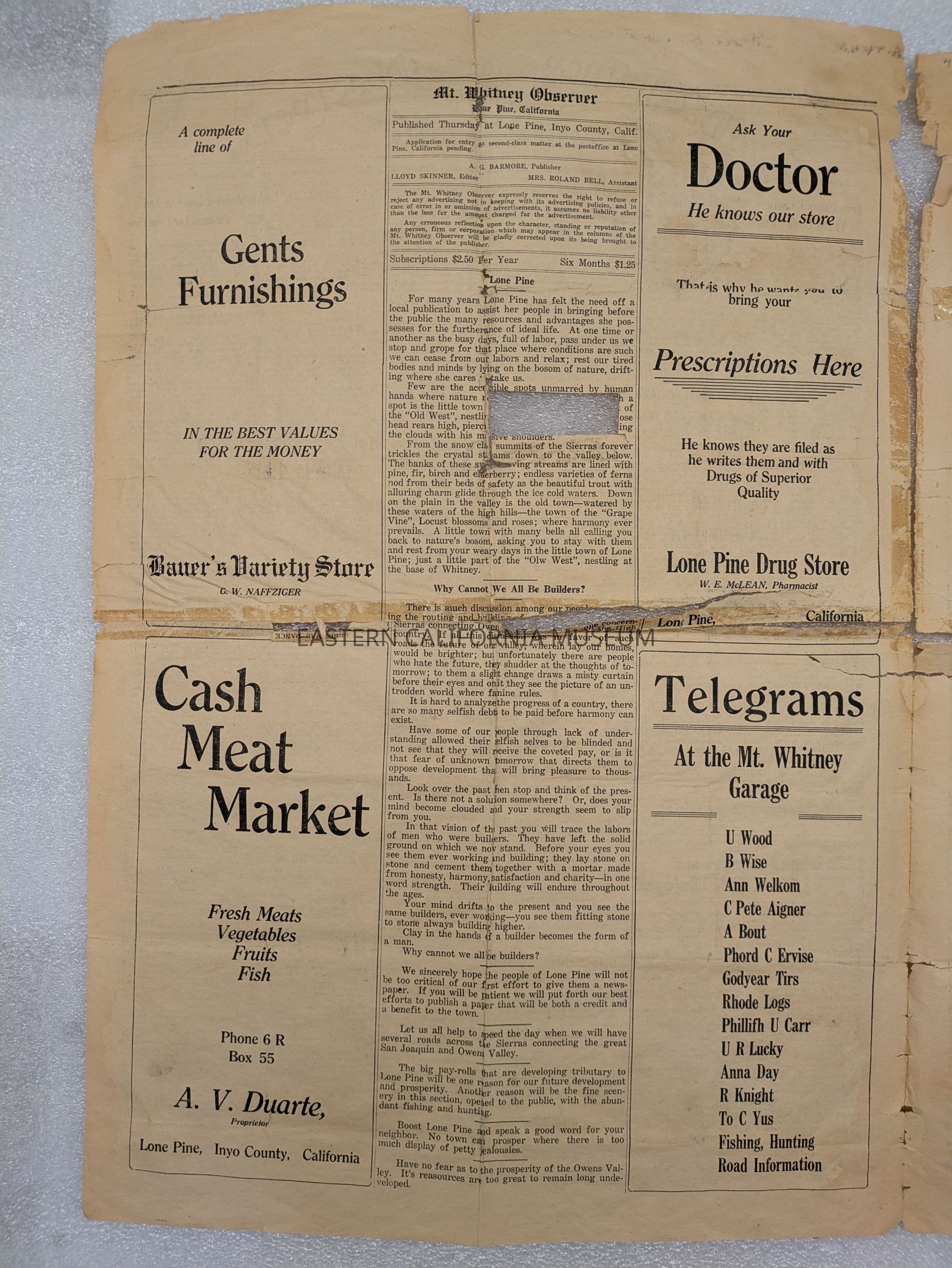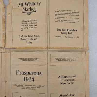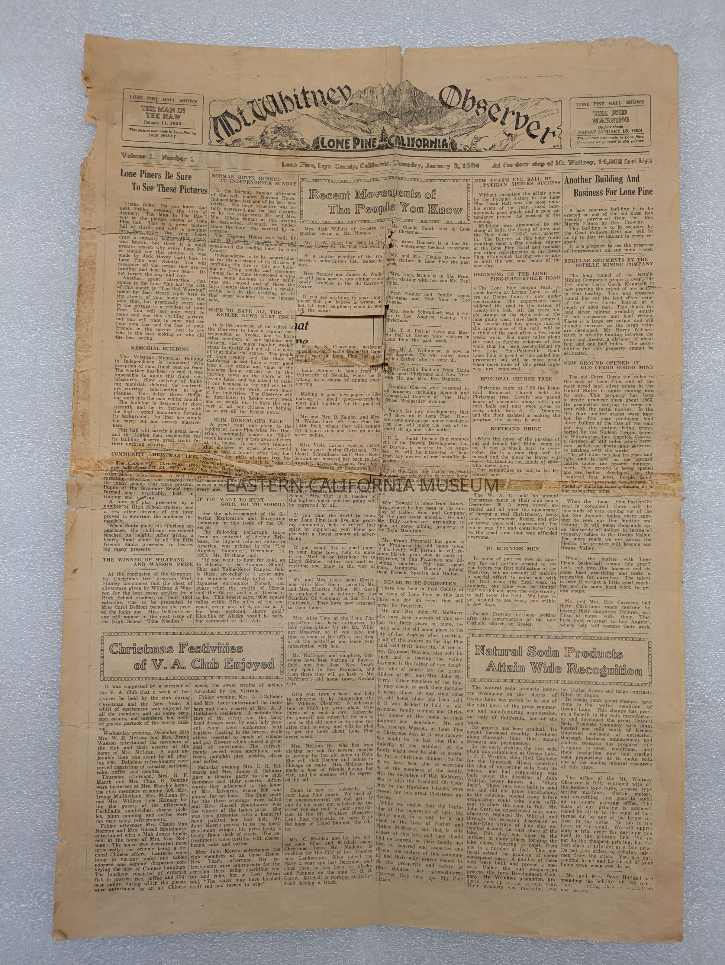 Newspaper: Mt. Whitney Observer, Vol. 1, No. 1, January 3, 1924. A. G. Barmore Publisher, Lloyd Skinner Editor, Mrs. Roland Bell Assistant.Collection