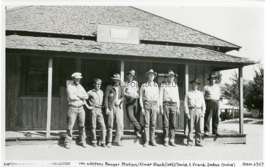 B&W glossy print: several men standing in front of Mount Whitney ranger station: Elmer Black(left)/David & Frank Dodge (twins) from ECM collection (Ramsey collection)