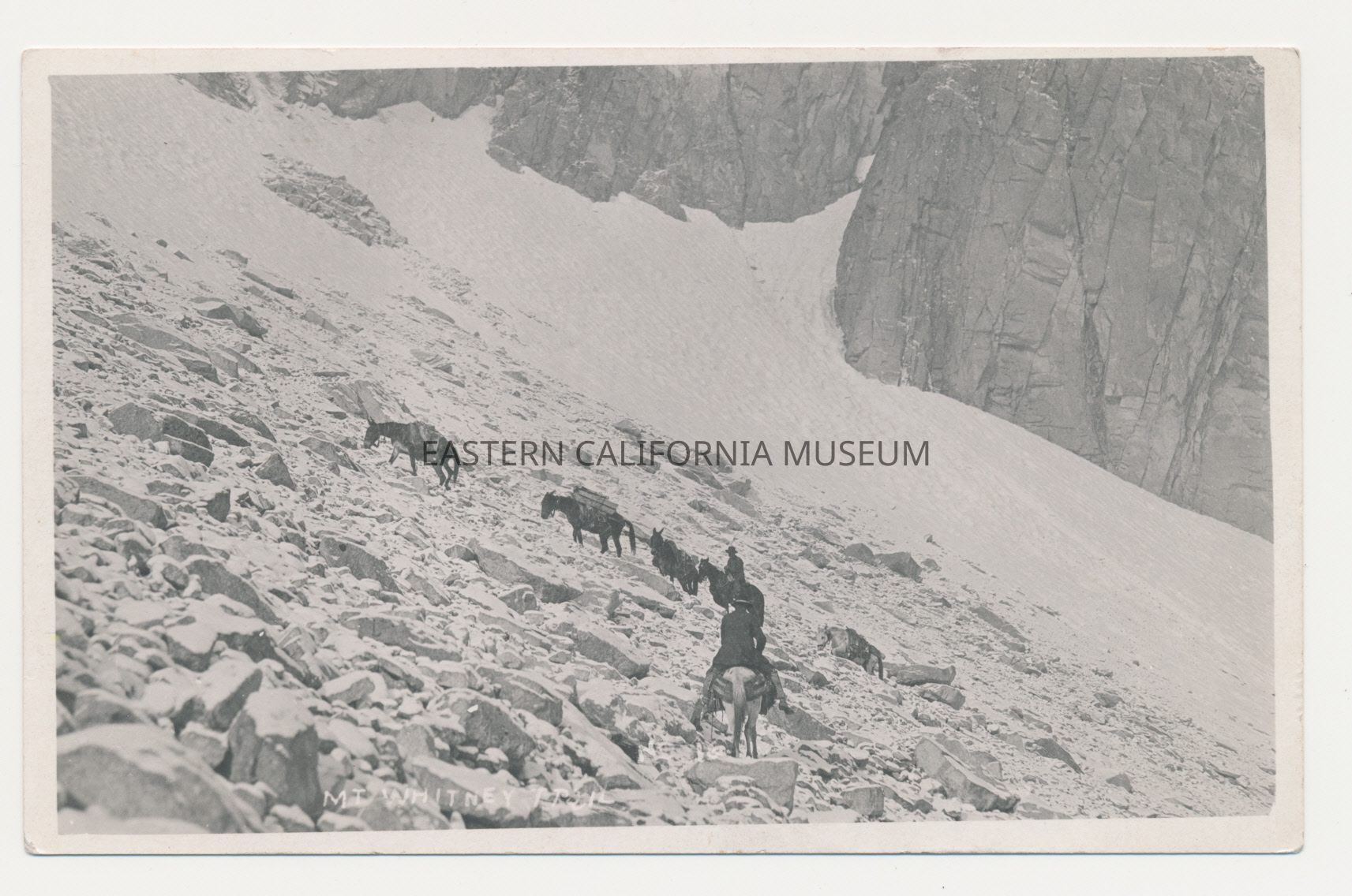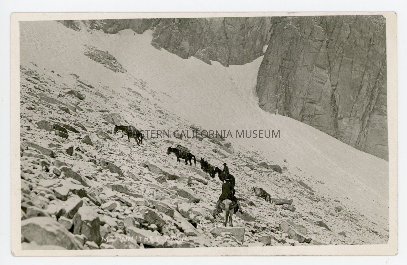 Photo postcard titled, "Mt. Whitney Trail" showing a pack train of mules and two people on horseback ascending a rocky scree. Lots of snow in the background.Collection