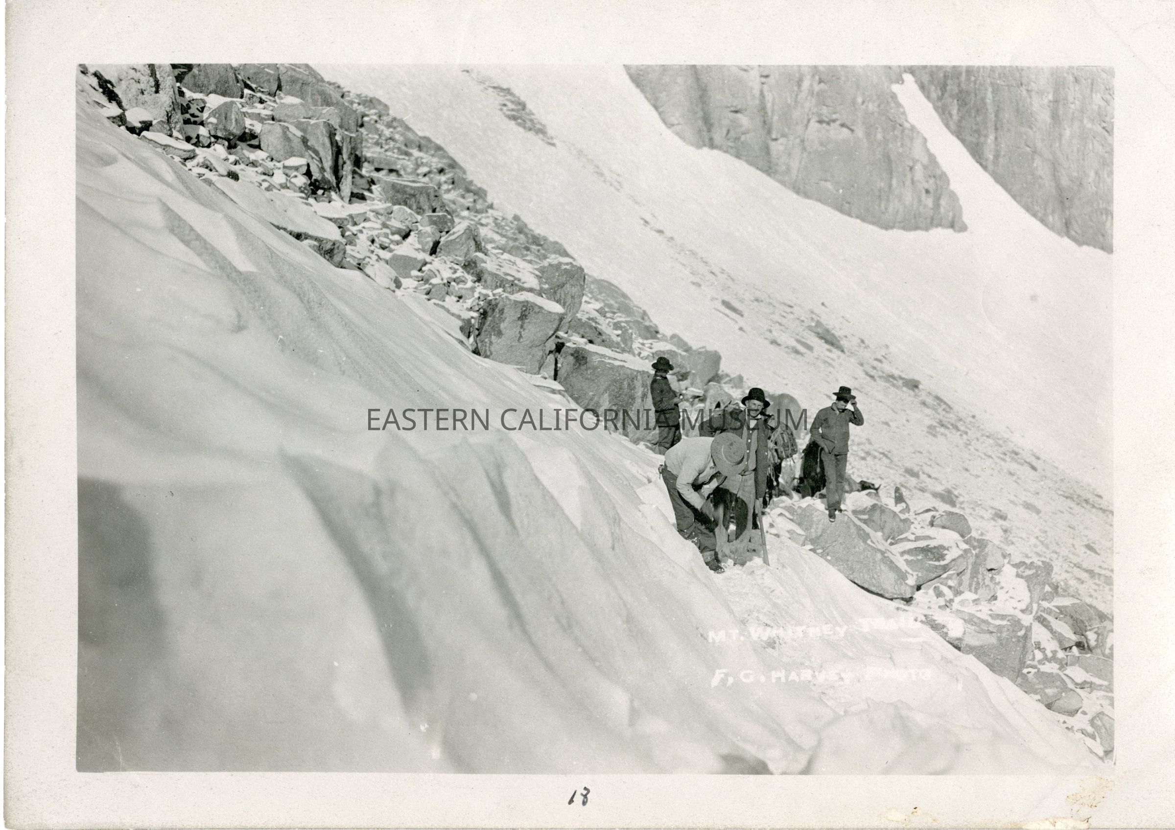 Photo titled, "Mt. Whitney Trail" taken by photographer Fred Harvey. Someone has written "18" in ink along bottom edge of photo. It shows four men and some horses or pack mules standing on a snowy mountainside. The man in the lead appears to be cutting a trail through the ice.