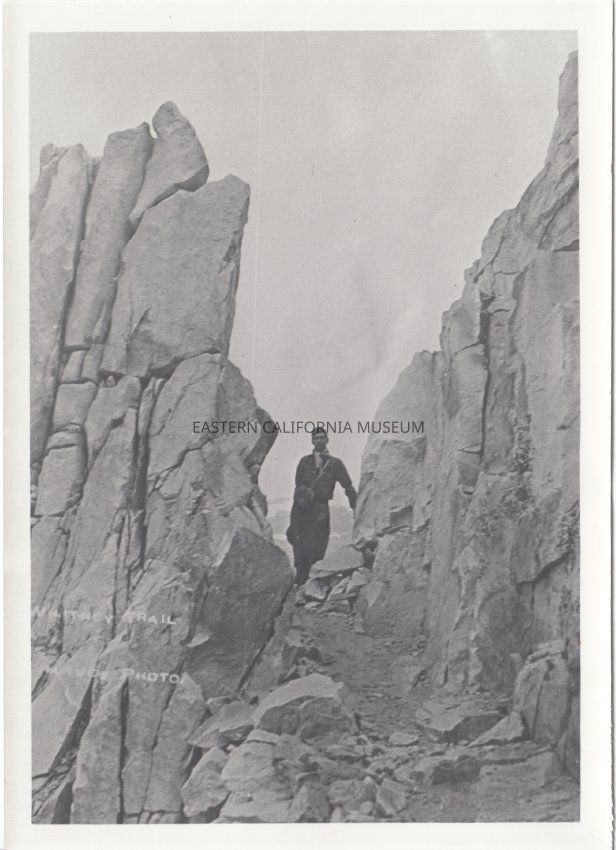 Photo titled "Mt. Whitney Trail" taken by photographer Fred Harvey. Someone has written "13" in pencil along the lower edge. It shows a man identified as Ross Spear standing on the trail where it narrows between two rock walls.Collection