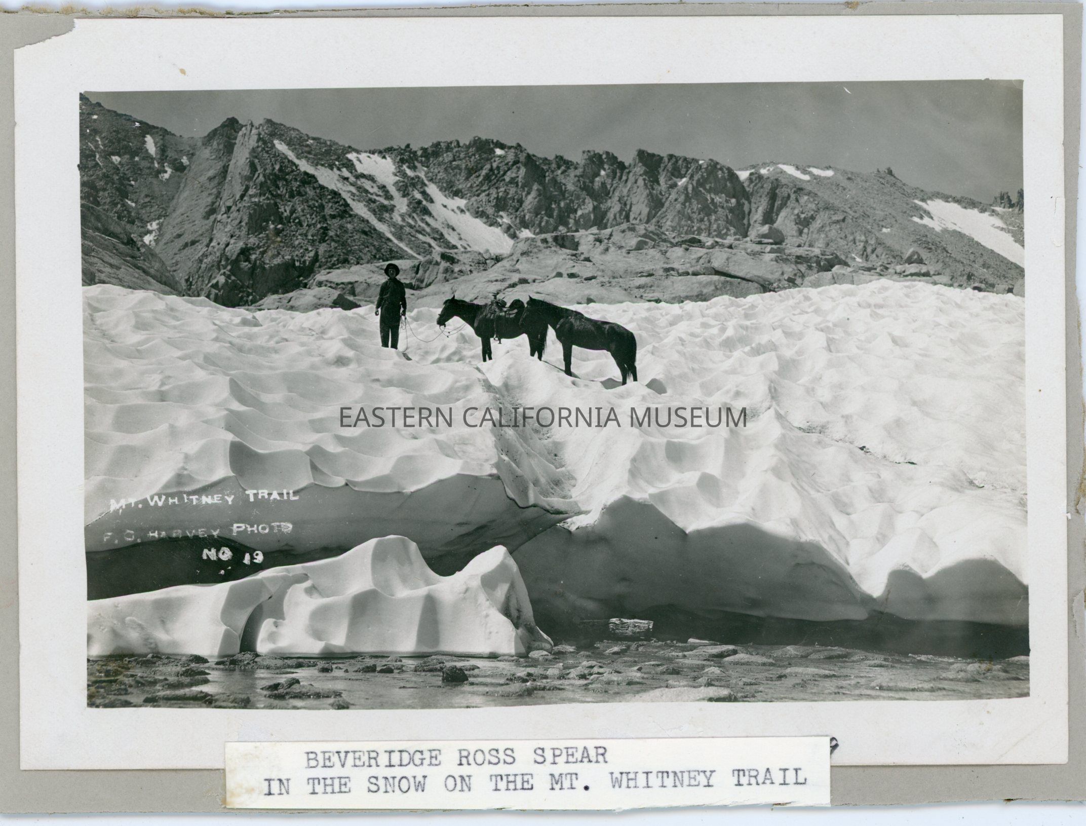 Photo titled, "Mt. Whitney Trail" taken by photographer Fred Harvey and given his ID #19. It shows a man with two horses standing on a snow bank. He is identified on an old label as Beveridge Ross Spear.