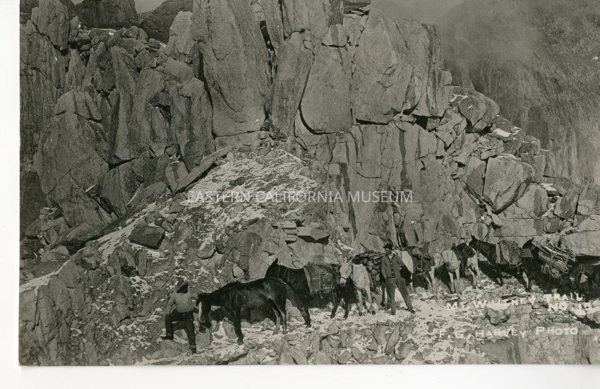 Photo postcard of two men leading a string of horses and mules who are carrying wood and other items along a rocky trail. It is titled, "Mt. Whitney Trail" and was taken by photographer F. G. Harvey and given his ID #15. A note on a duplicate copy identifies the man in the center of the picture wearing a sweater as Beveridge Ross Spear.