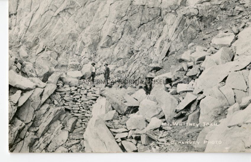 Photo postcard of three men on a rocky trail. The three men are most likely Horace Elder, Bill Skinner, and Oscar Burkhardt. It is titled, "Mt. Whitney Trail" and the photographer was F. G. Harvey. This postcard was mailed from Lone Pine in 1909 to Mrs. C. W. Robinson in Independence.