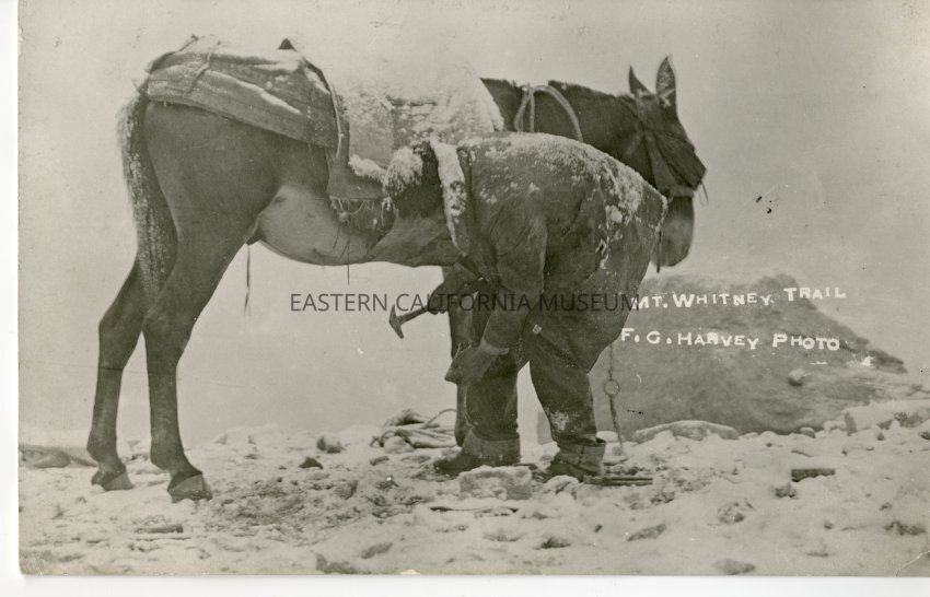 Written in pencil on reverse: Horace Elder shoeing a mule on top of Mt. Whitney in a snow storm.