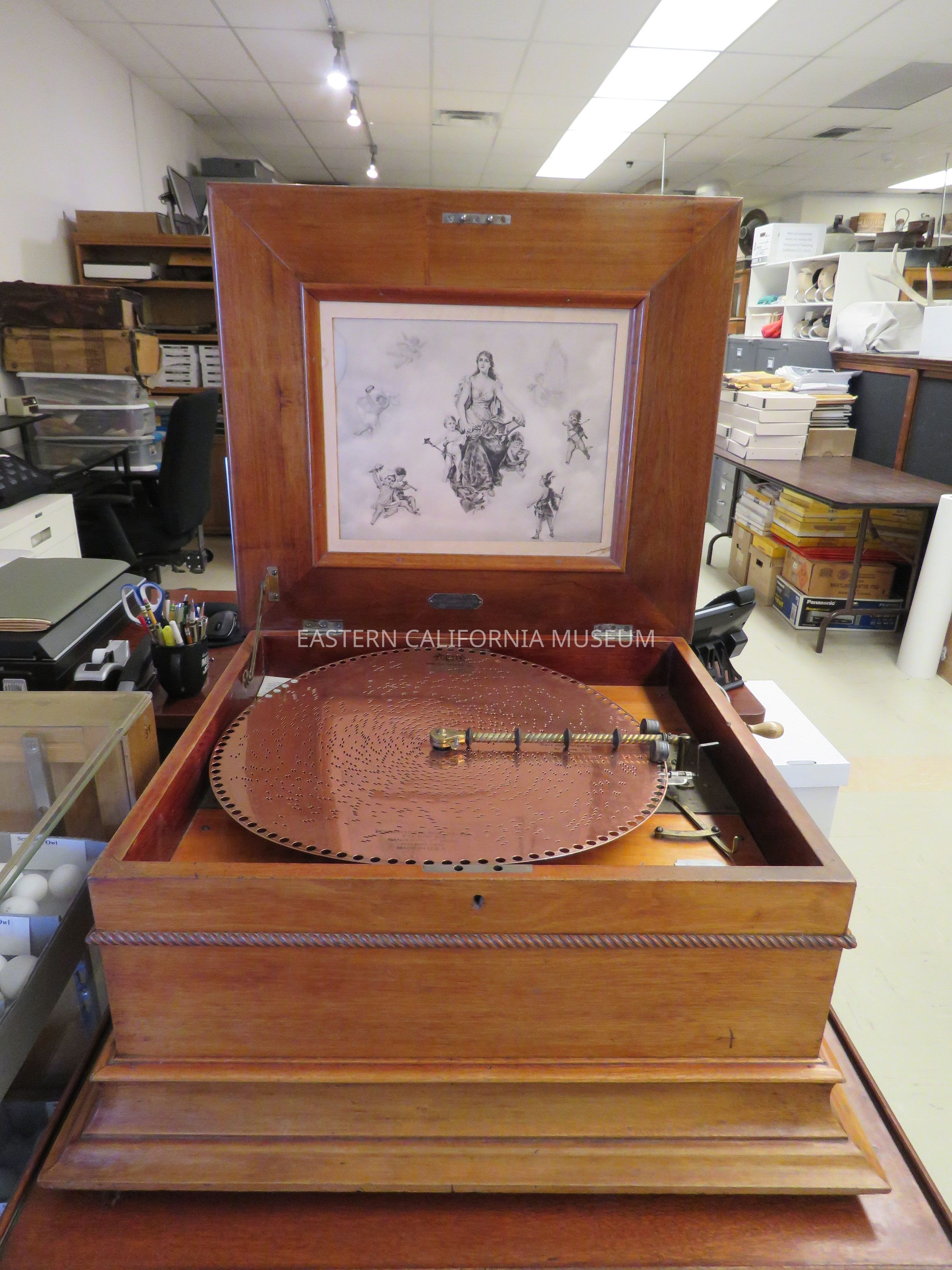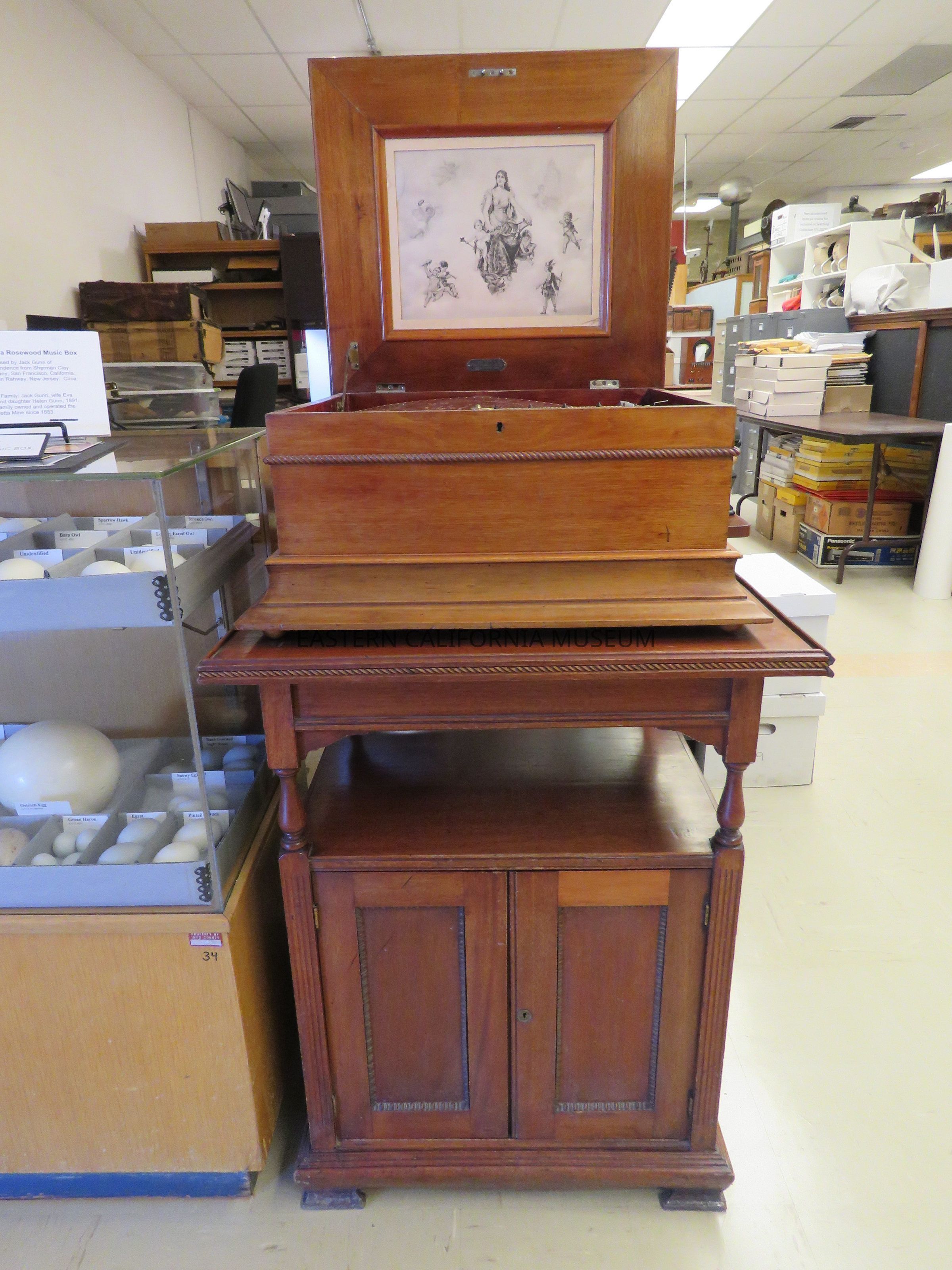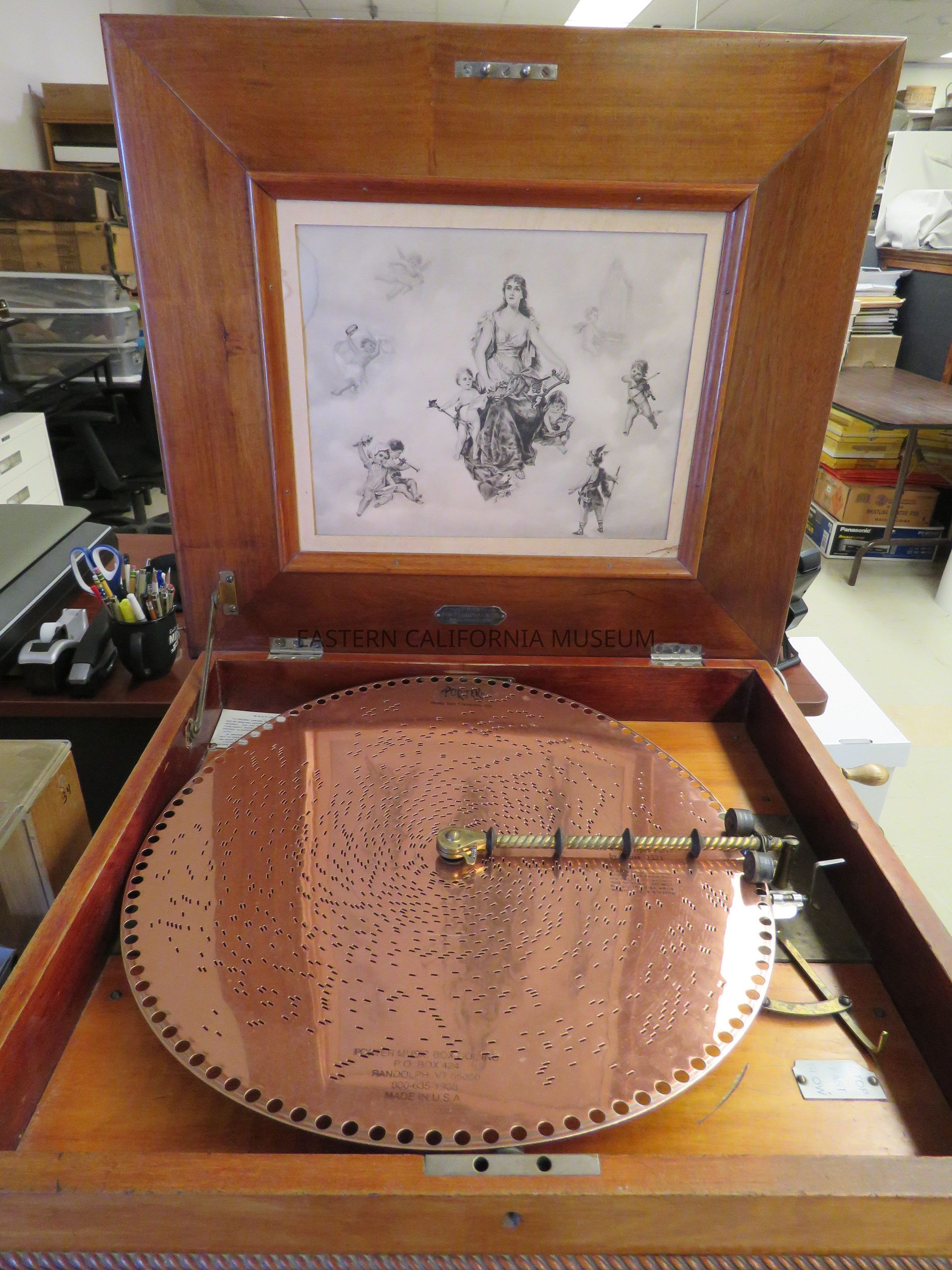 This rosewood music box belonged to the Gunn family and was purchased in San Francisco by Jack Gunn. It includes a rosewood stand that has a cupboard to store the records or discs in.Collection