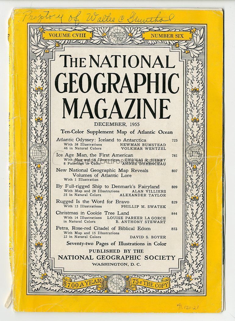 "National Geographic Magazine, Vol. CVIII, No. 6, December 1955" has " Property of Walter C. Grunthal" written on front cover and is composed of the cover of the magazine stapled to one article titled "Ice Age Man, the First American."Publication Details