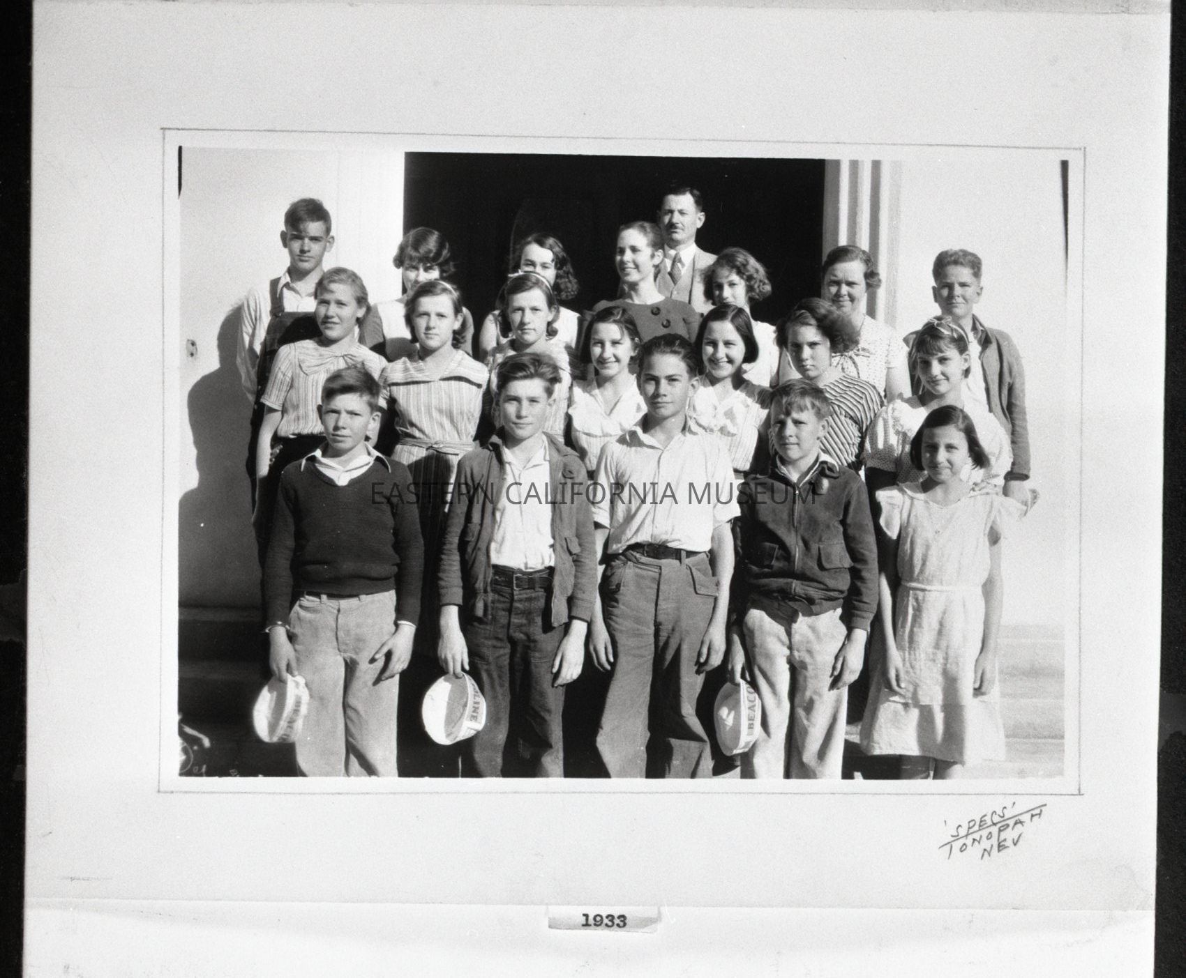 Negative of a class photo of students at Owens Valley School in 1933. The photographer was Specs of Tonopah, NV.