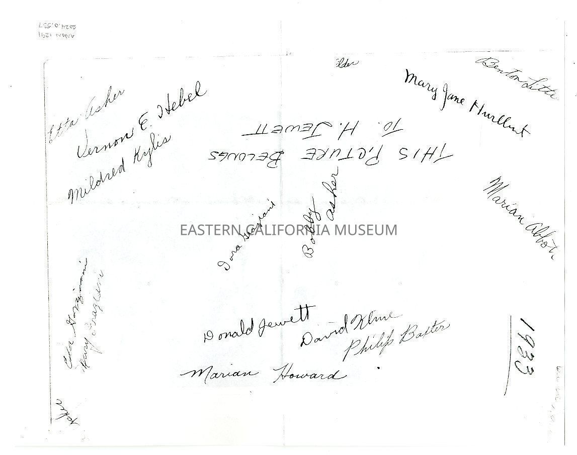 Signatures on the reverse include: Etta Asher, Vernon E. Hebel, Mildred Kylis, Elder, Benton Little, Mary Jane Hurlbut, Eda Graziani, Mary Graziani, Donald Jewett, David Kline, Philip Baxter, Marian Howard, Asher, and Gina F.
