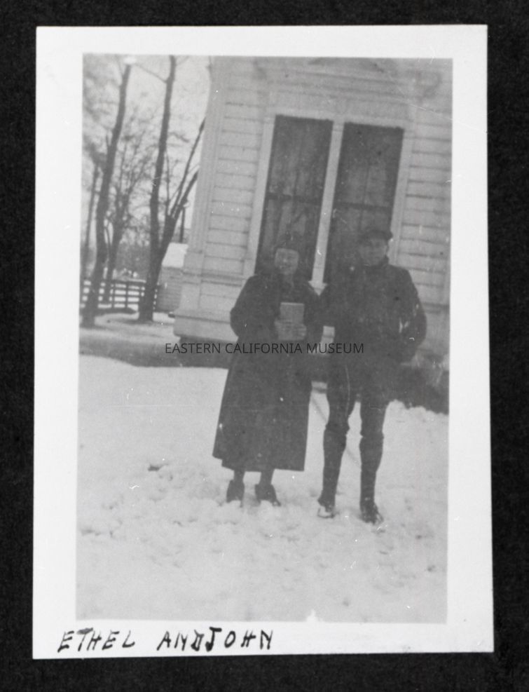 Photo taken of a photo in an album. It is of a couple standing in the snow in front of the (third) Courthouse in Independence. She is holding something in her hands, maybe a book or present? Someone has written along the bottom edge of the photo, "Ethel and John."