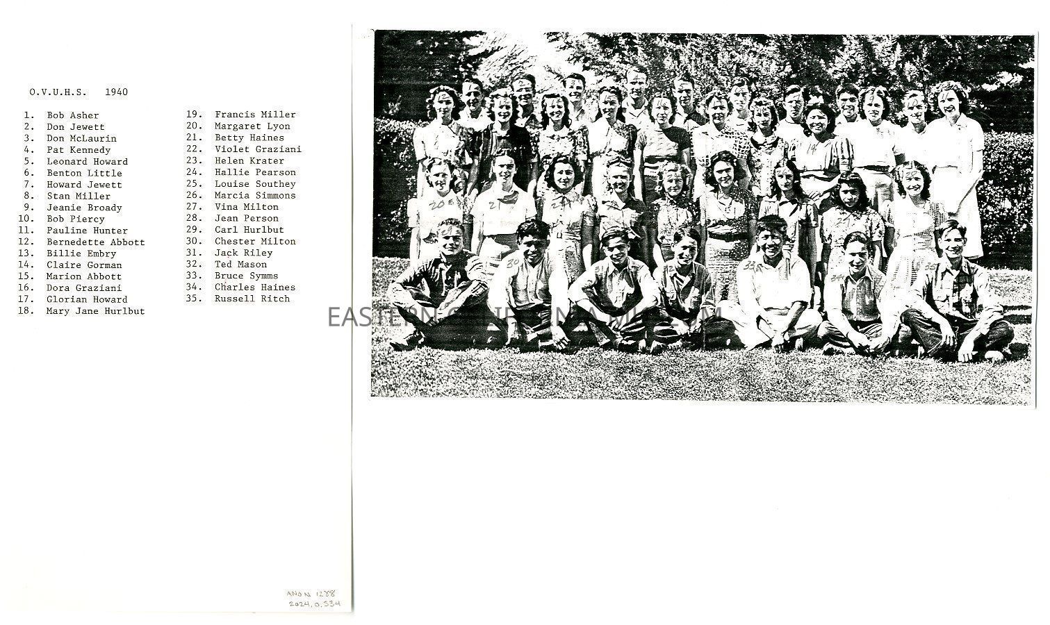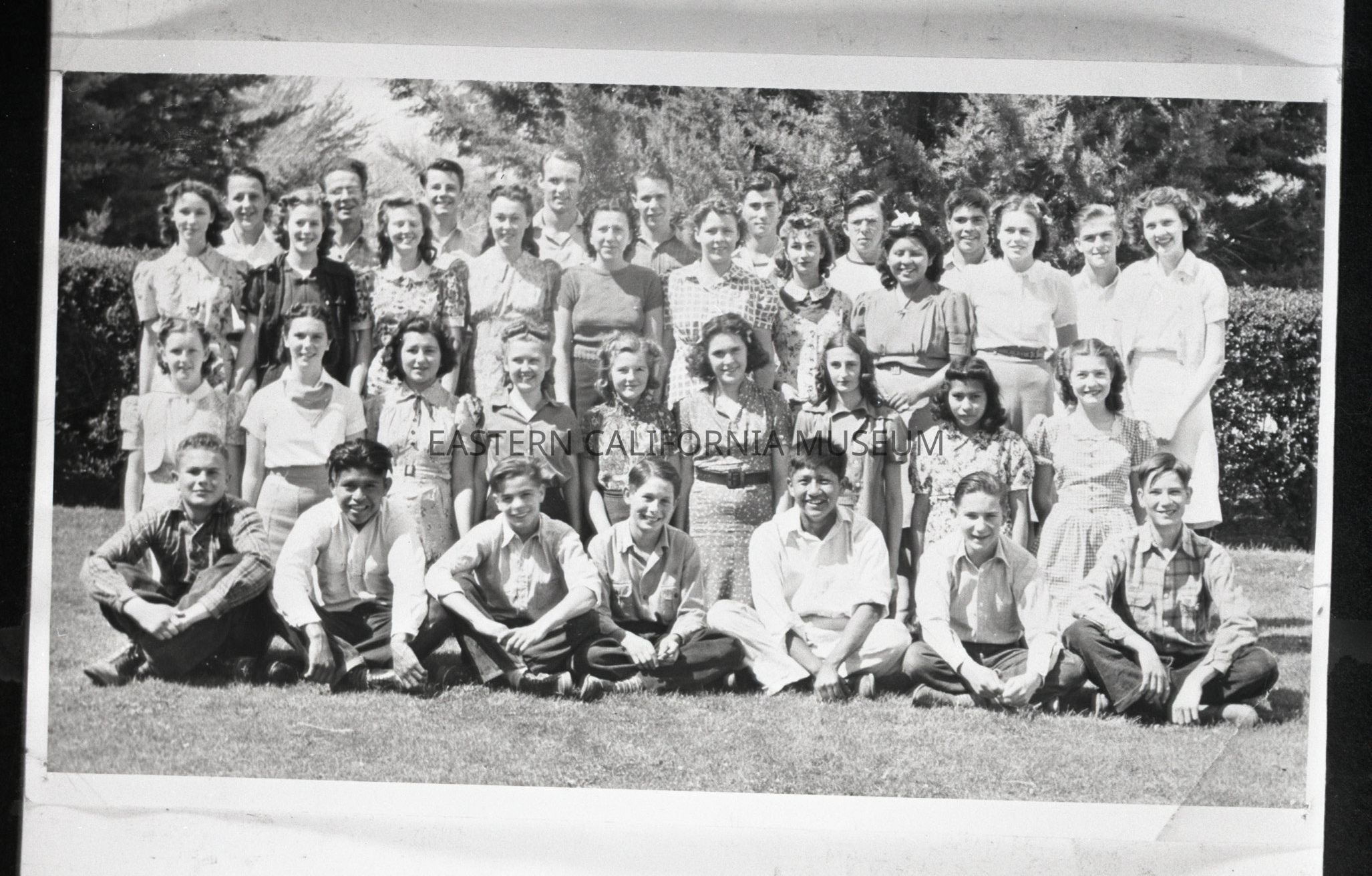 Negative of a class photo of students at Owens Valley High School in 1940.