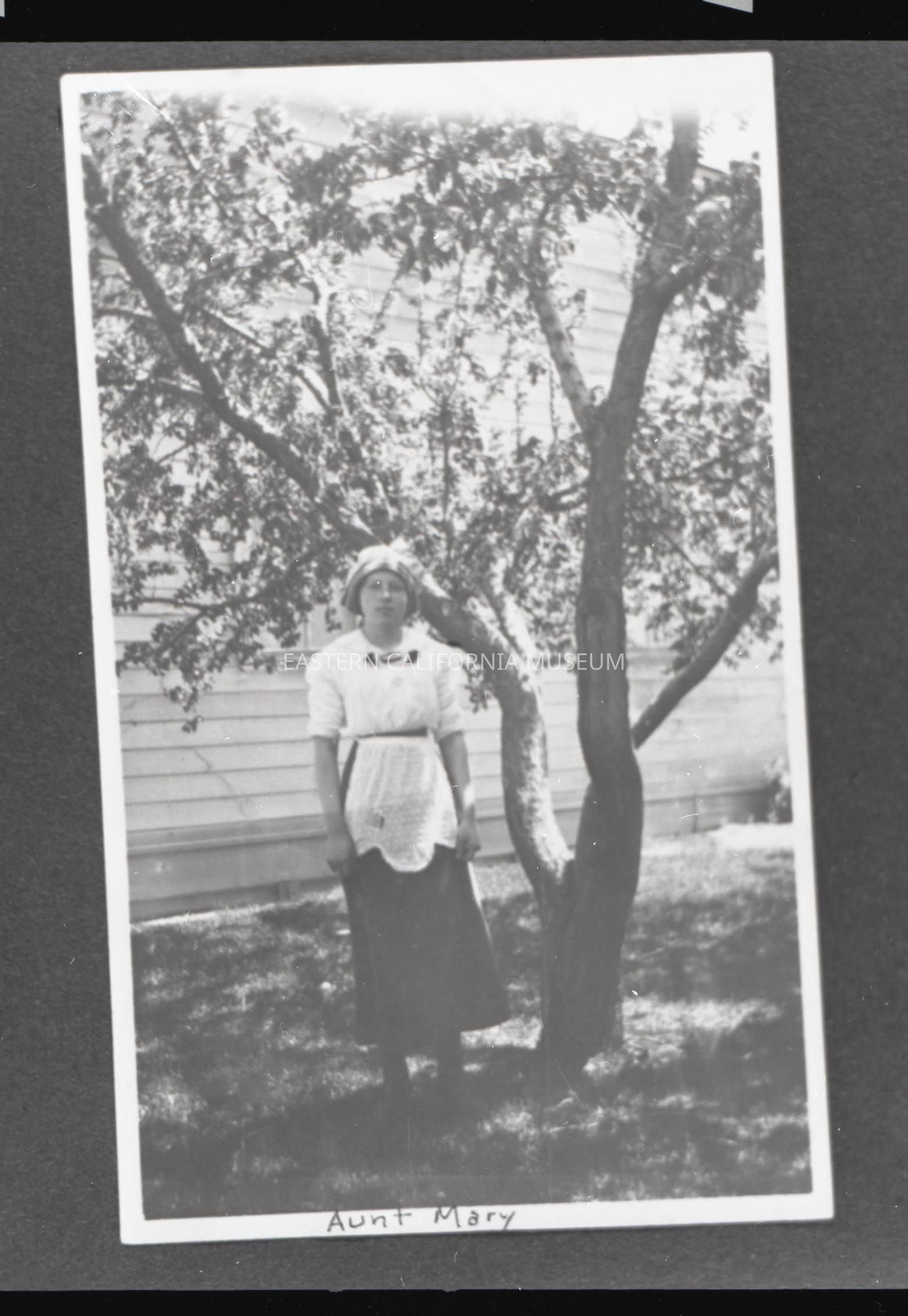 Photo taken of a photo in an album. It is of a woman wearing and apron standing in front of a tall building under a tree. She is identified as "Aunt Mary."