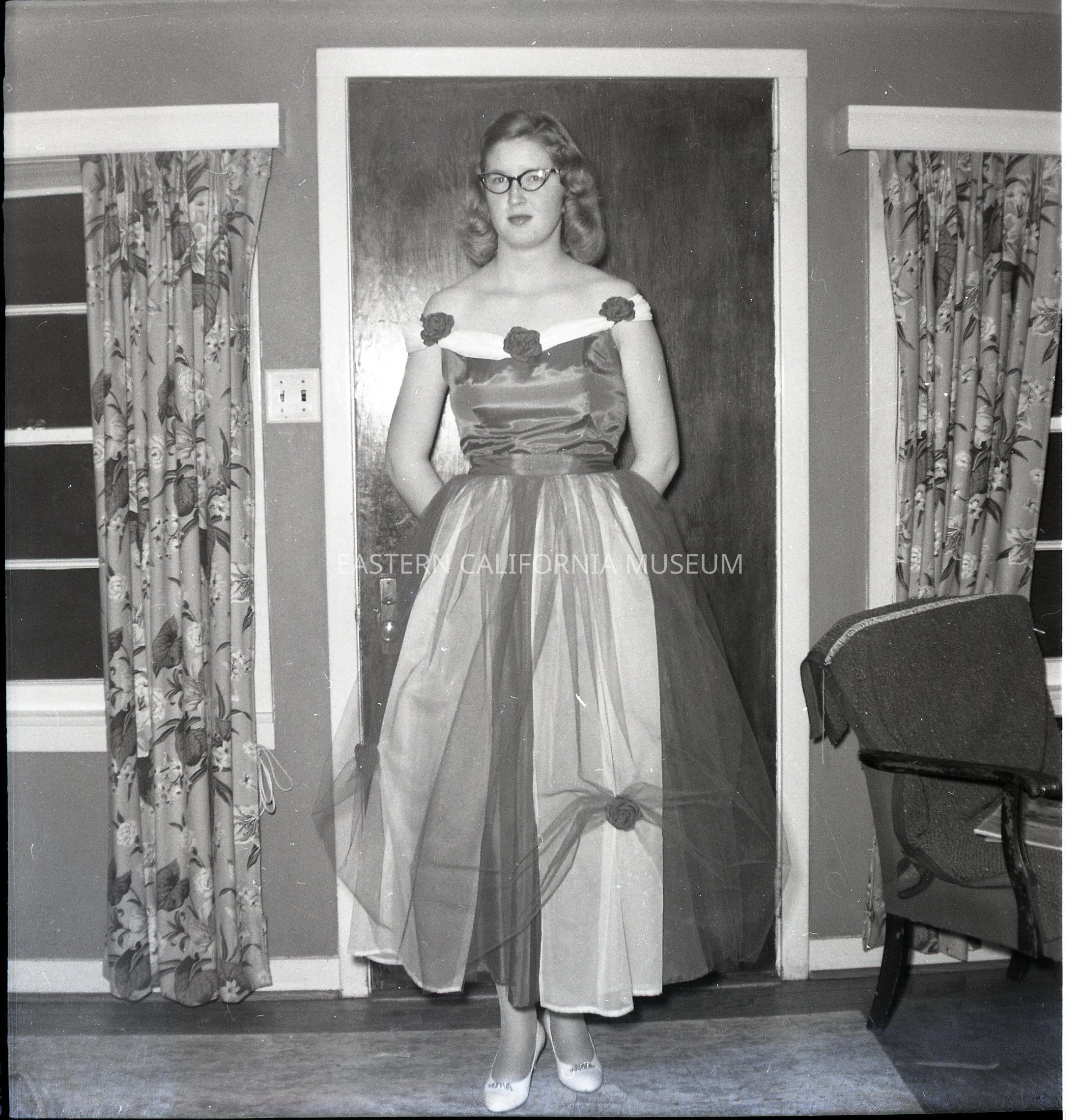 Negative of a young woman wearing glasses dressed in what appears to be a prom dress (tule and rosettes). She appears in several photos in this collection; possibly a Smith family member?Collection