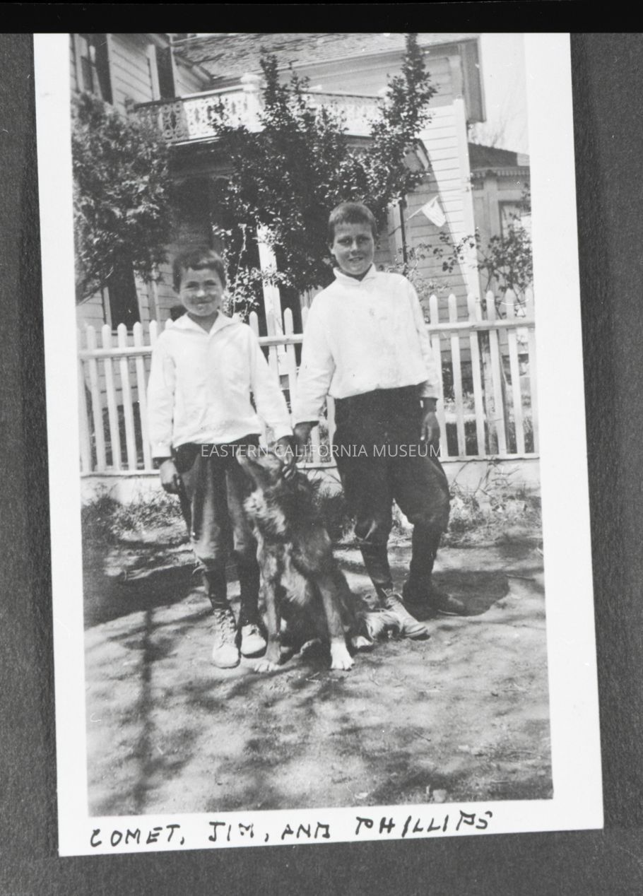 Photo taken of a photo in an album. It is of two young boys wearing dark pants and white shirts standing in front of the Commander's House in Independence. Someone has written along the bottom edge of the photo, "Comet, Jim and Phillips." The dog is Jim. The mother of these boys is Minnie Singlaub Brooks, who is the (half?) sister of Mary Singlaub Levy Gillespie and John A. Singlaub.