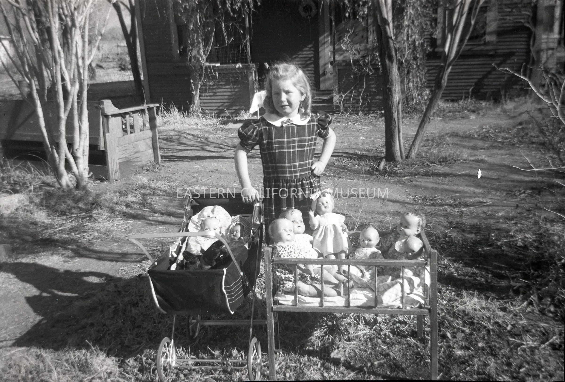 Negative of Thelma Ruth Smith posing with a baby carriage/stroller, doll bed/crib, and eight dolls. Photo was taken about 1947 in Lone Pine, CA. See photos 1991.13.1.65-66.Photograph Details
