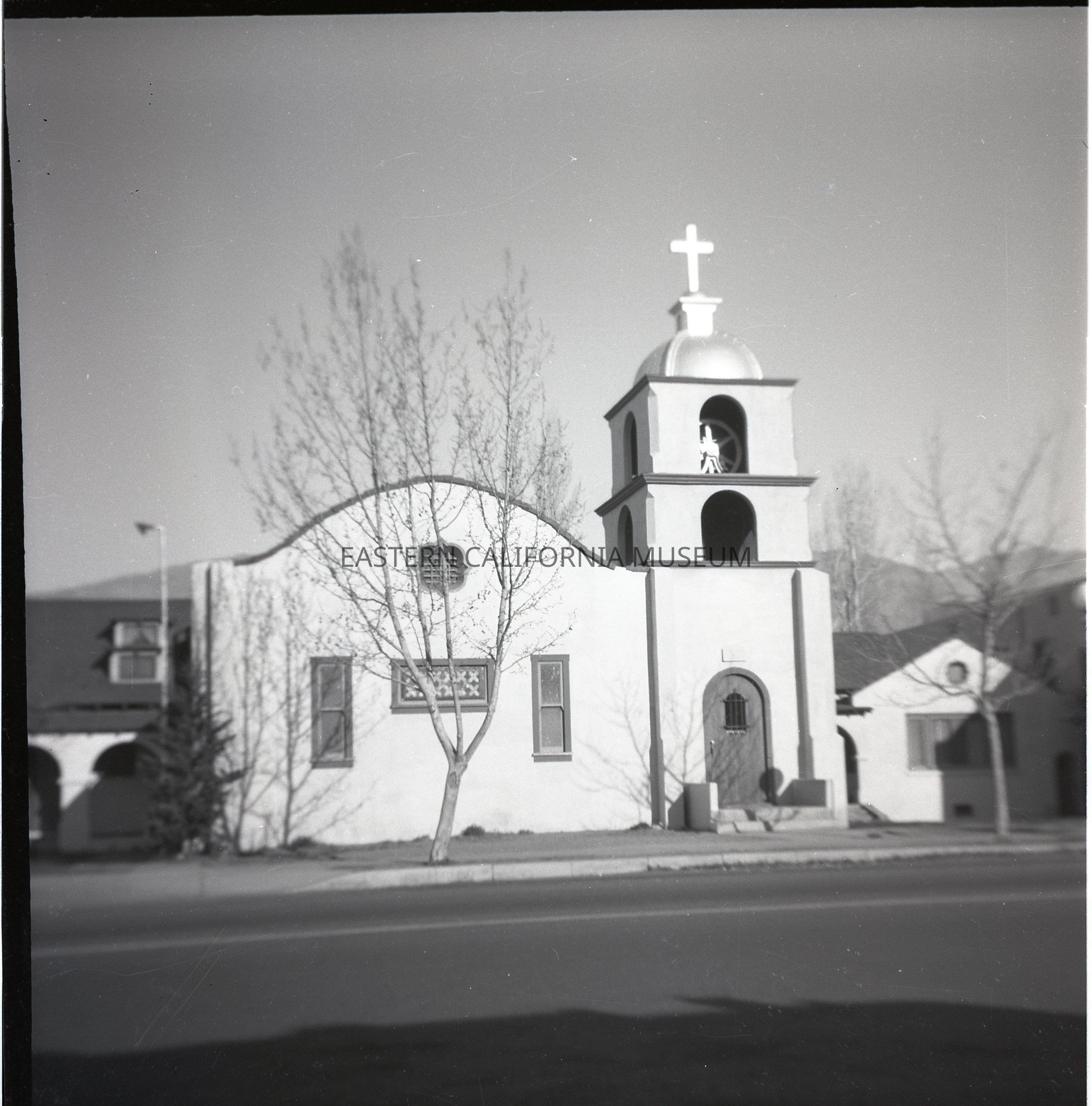 Negative of the Santa Rosa Catholic Church in Lone Pine, CA.