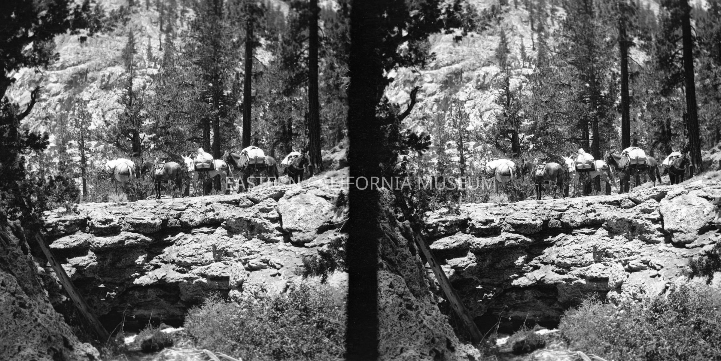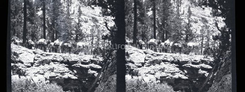 Negative of a stereoscopic image of a packtrain near a cliff or crevasse. It looks to be volcanic rocks (lava?). Maybe the Mono County or Mammoth area? Appears to be same location as 2014.14.2.Made/Created