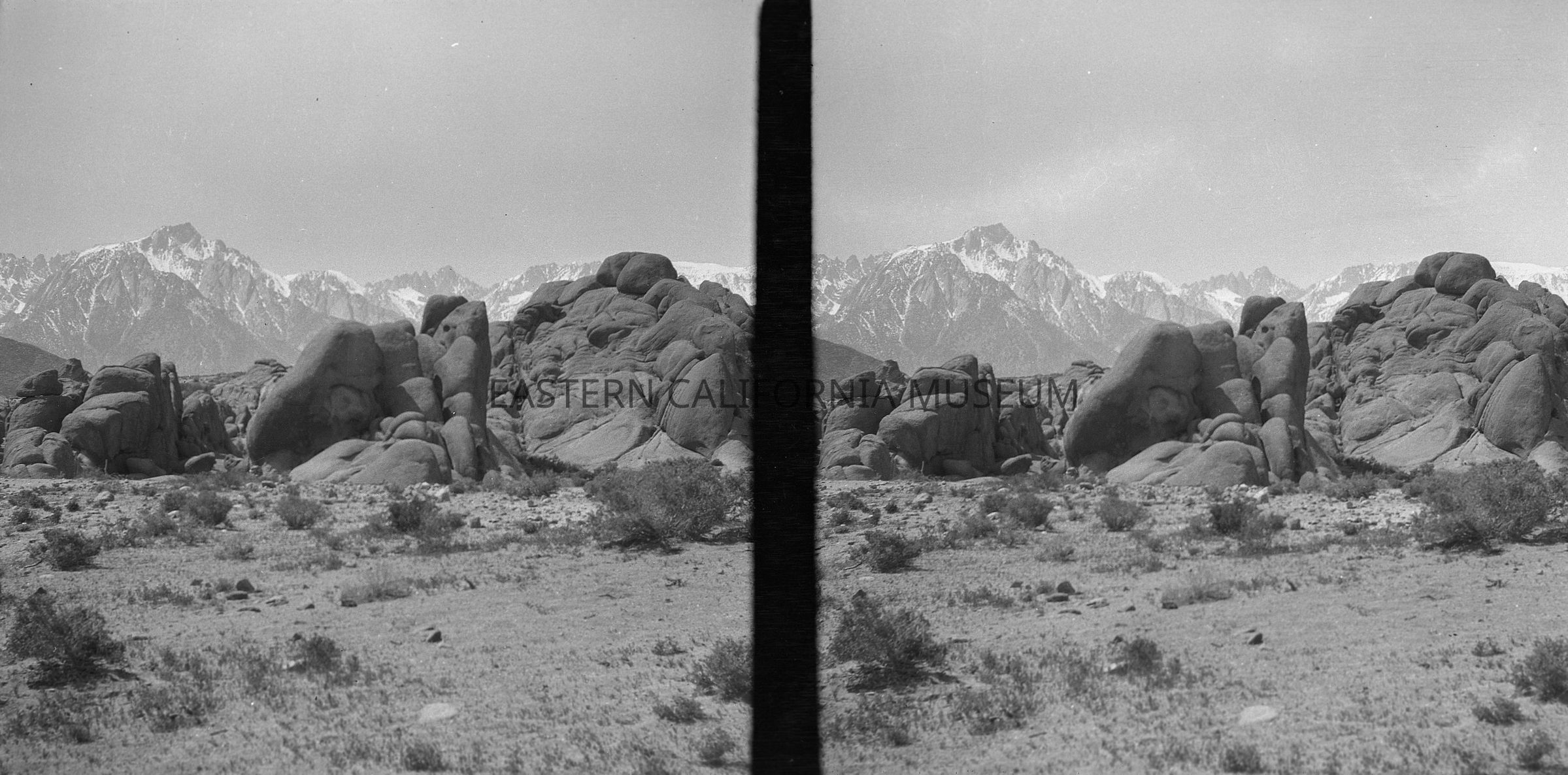 Negative of a stereoscopic image of Alabama Hills with snow-capped Sierra Nevada mountain range in background.