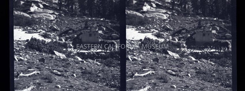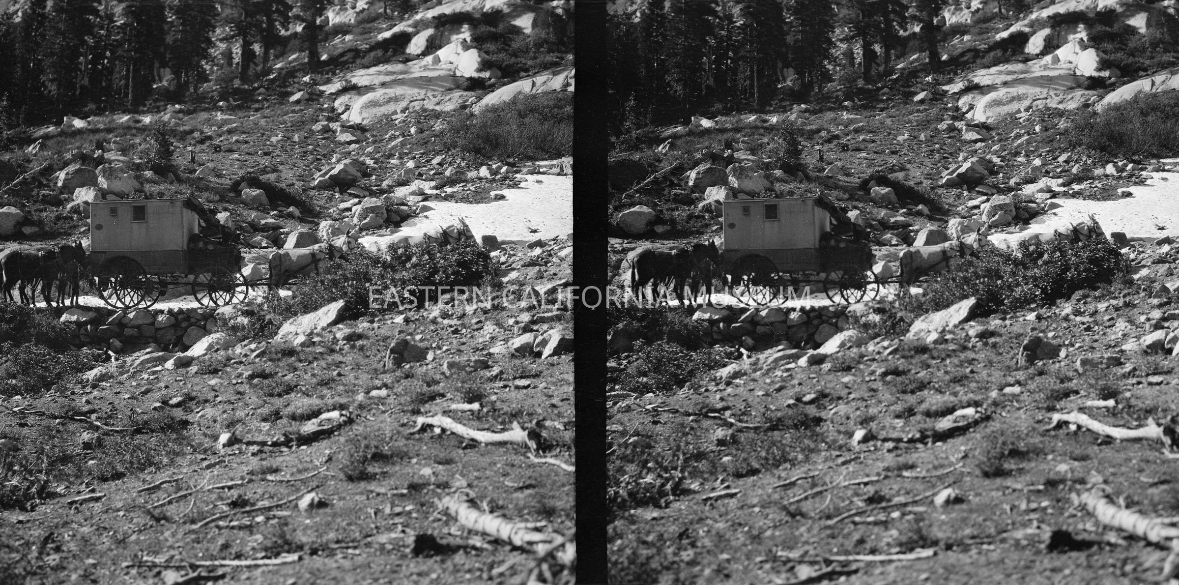 Negative of a stereoscopic image of Matt Wolfskill's travelling darkroom wagon on a mountainside.