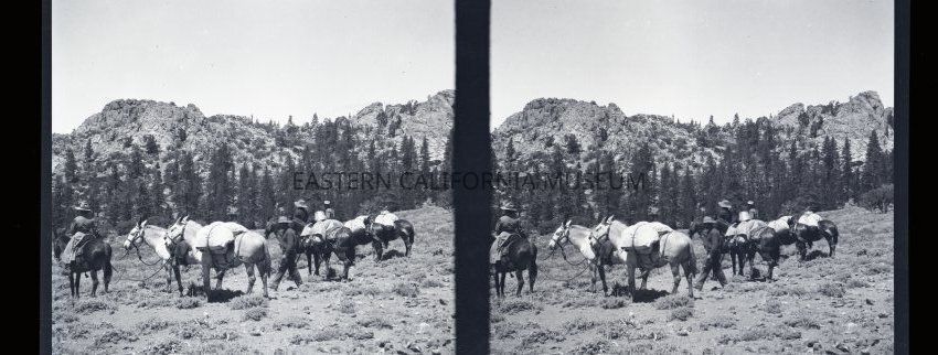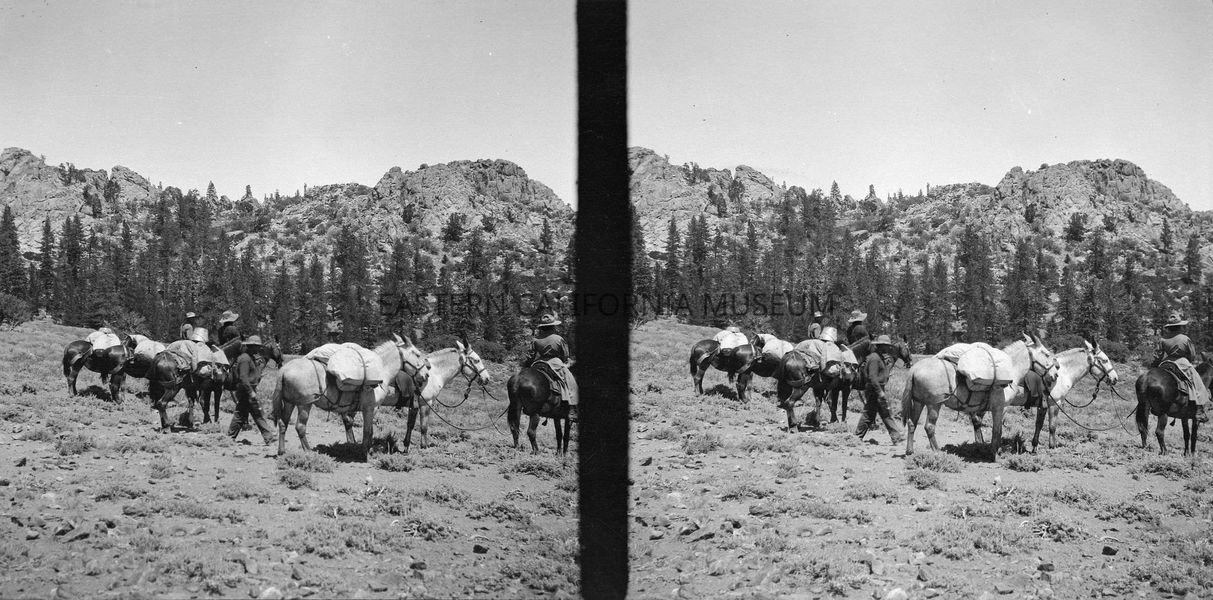 Negative of a stereoscopic image of four people on a packtrain. They are in an open area with trees and mountains in background.