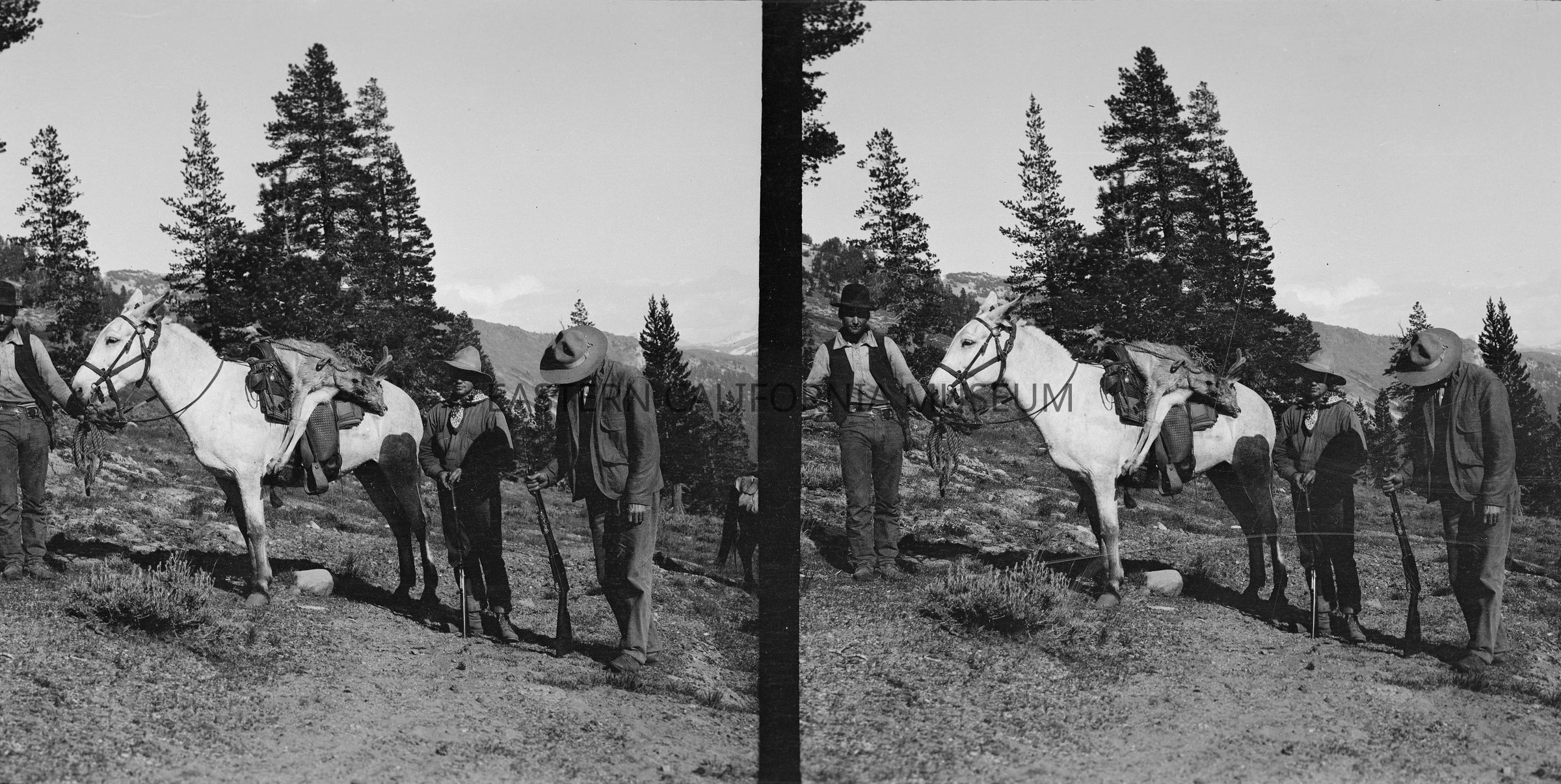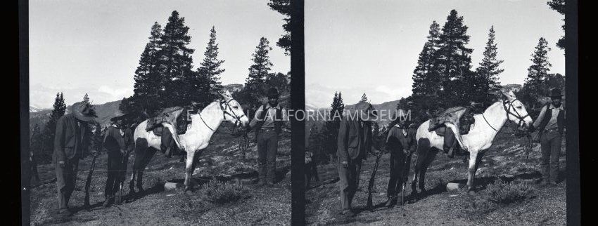 Negative of a stereoscopic image of three people with a deer they hunted slung over the saddle of one of their horses.