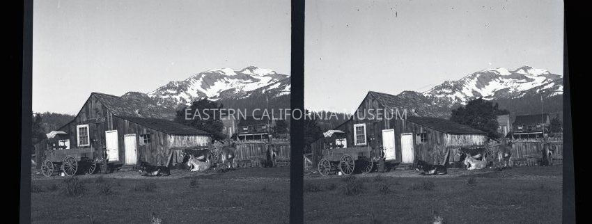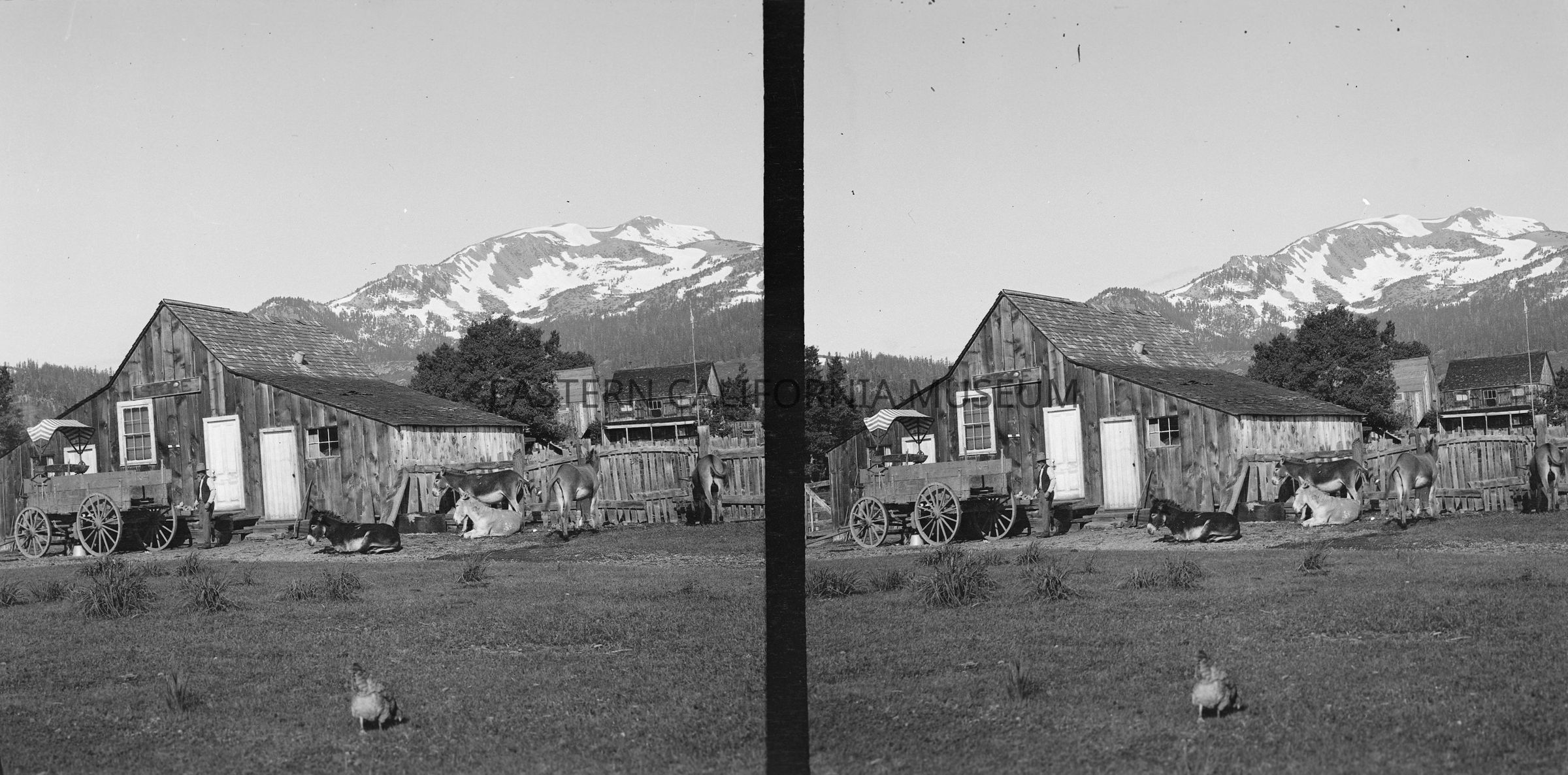 Negative of a stereoscopic image of a large wood building with a sign saying, "Store." There are donkeys/mules/burros, a wagon, and a man in front. There are more buildings (houses?) in the background. Snow-capped peak in background as well.