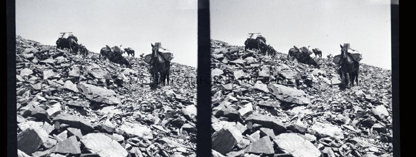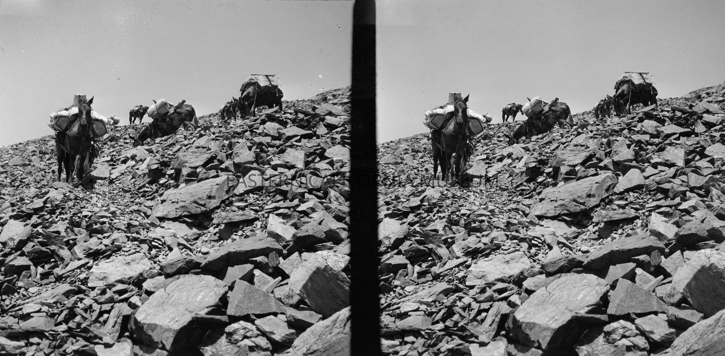 Negative of a stereoscopic image of a packtrain descending a steep, rocky scree.