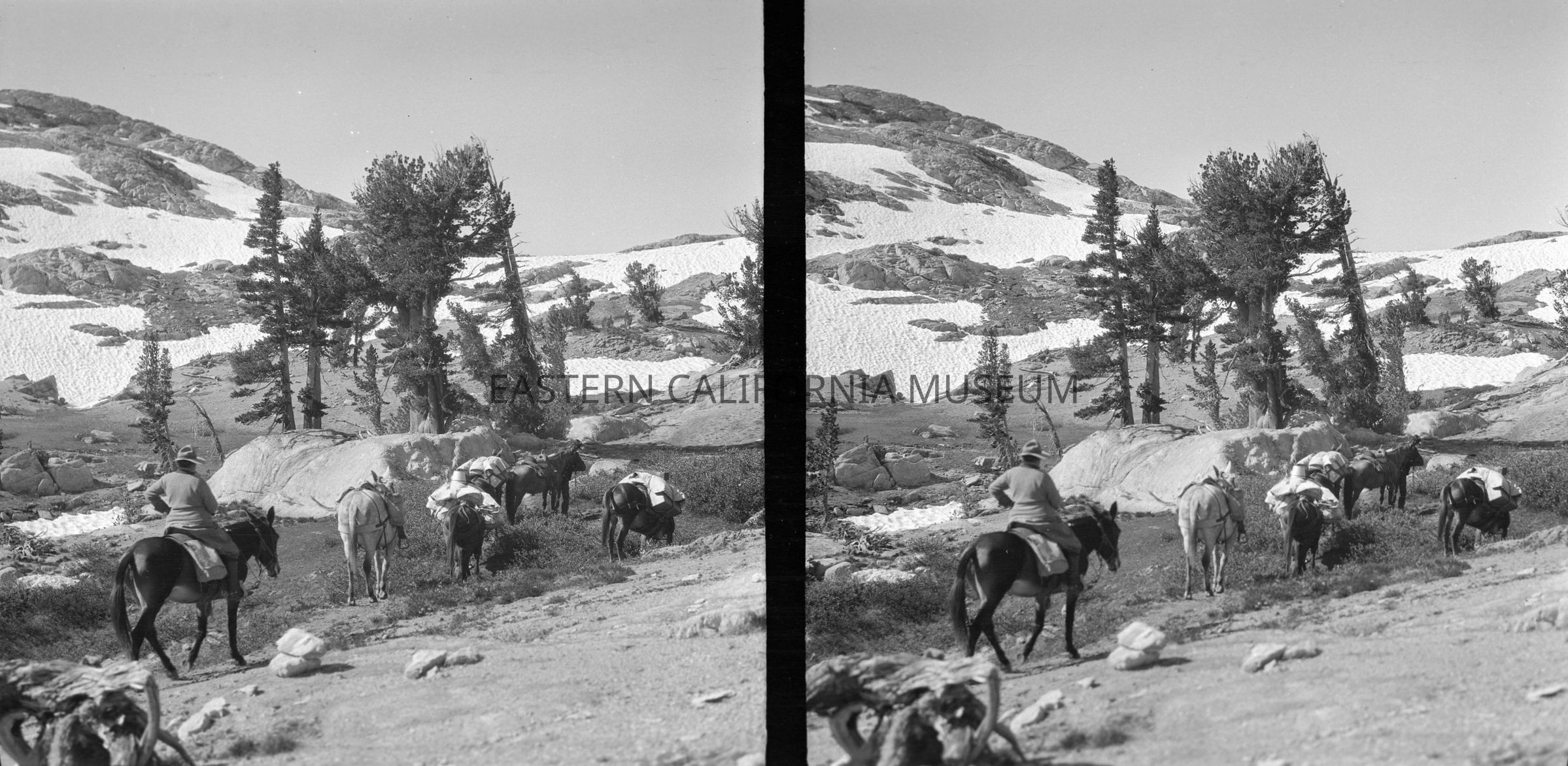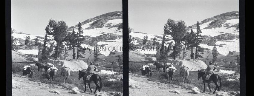 Negative of a stereoscopic image of a packtrain at a high enough elevation to be surrounded by patches of snow.