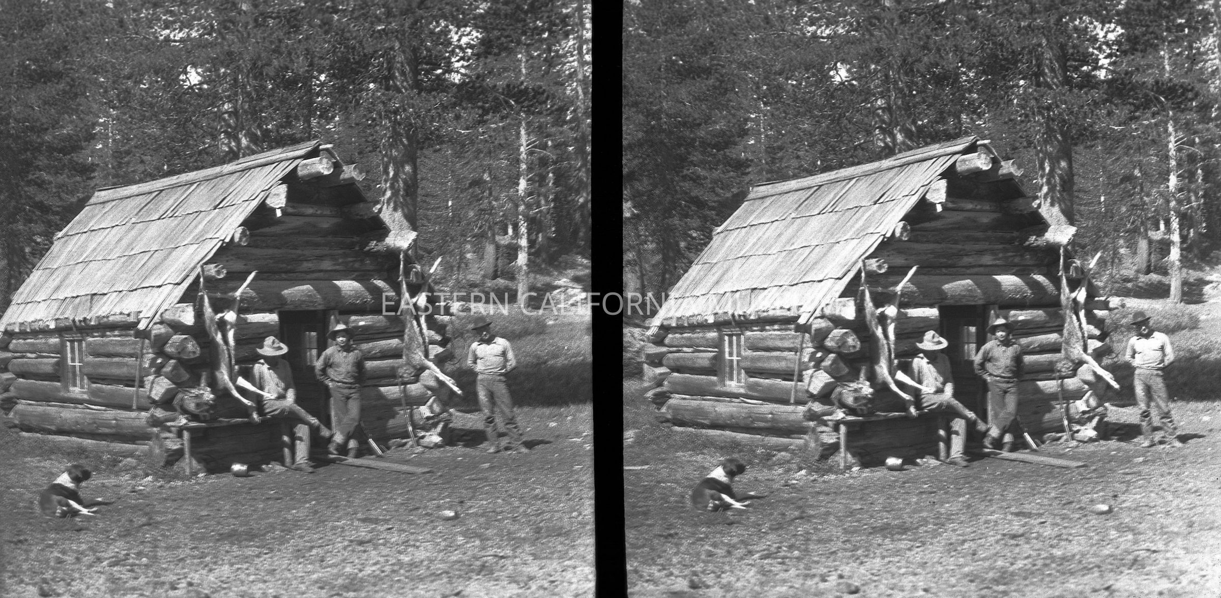 Negative of a stereoscopic image of three men standing in front of a log cabin. Two deer carcasses are hanging from walls.