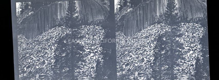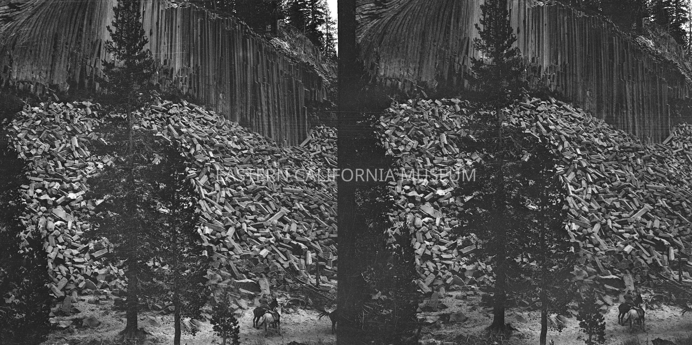 Negative of a stereoscopic image of Devils Postpile. There are a few members of the packtrain in the lower corner.