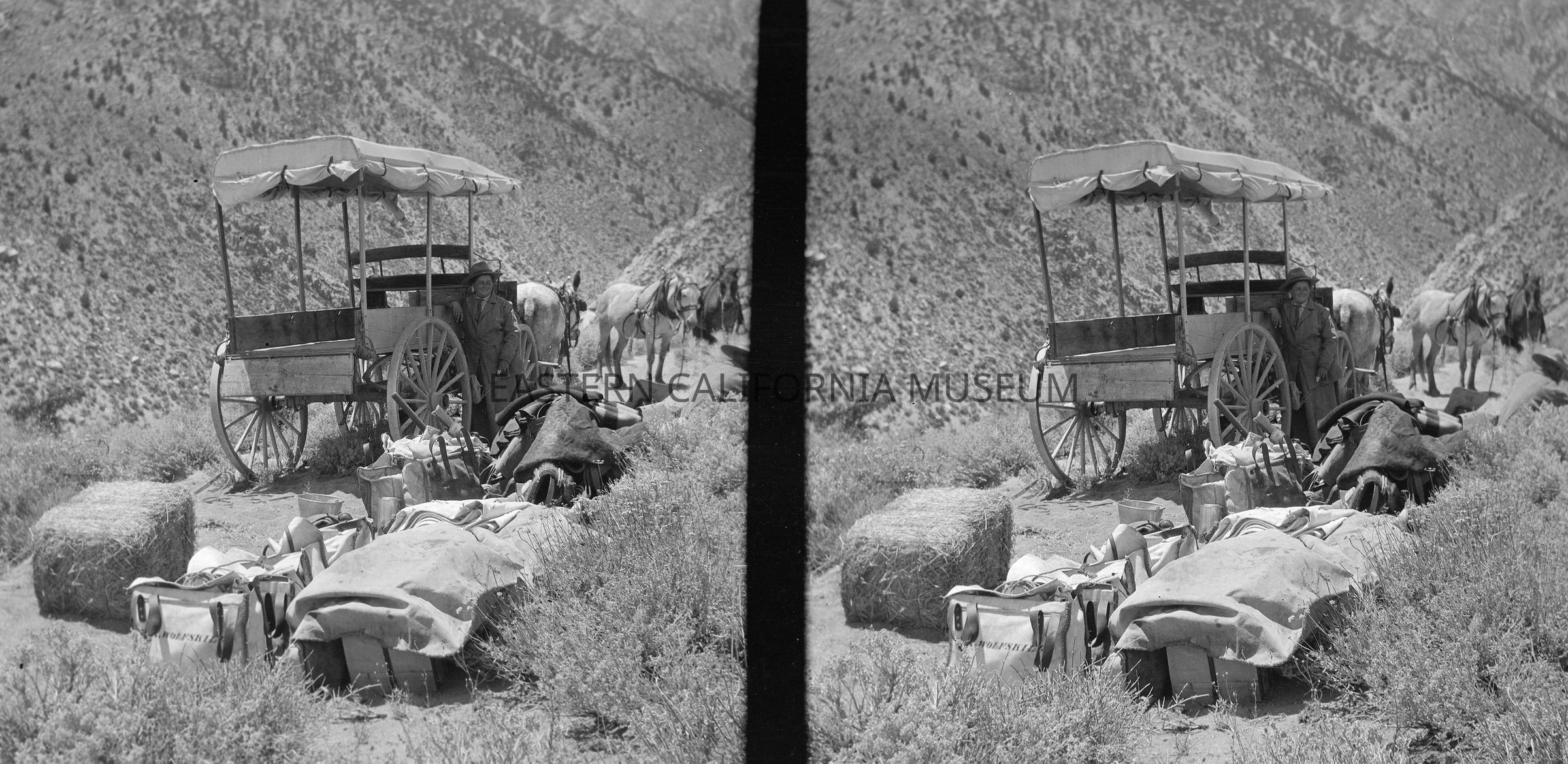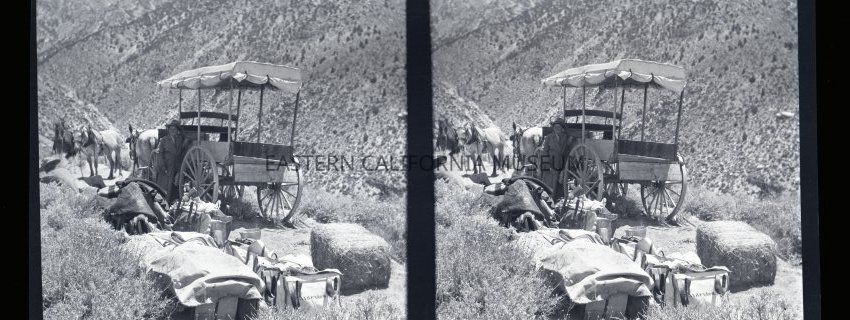 Negative of a stereoscopic image of a woman posing next to an unloaded wagon. It looks as though they plan to go up a canyon. One of the bags is labeled with Matt Wolfskill's name.Made/Created