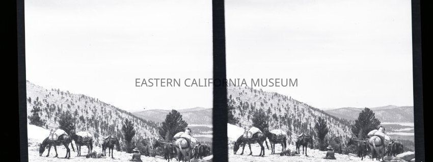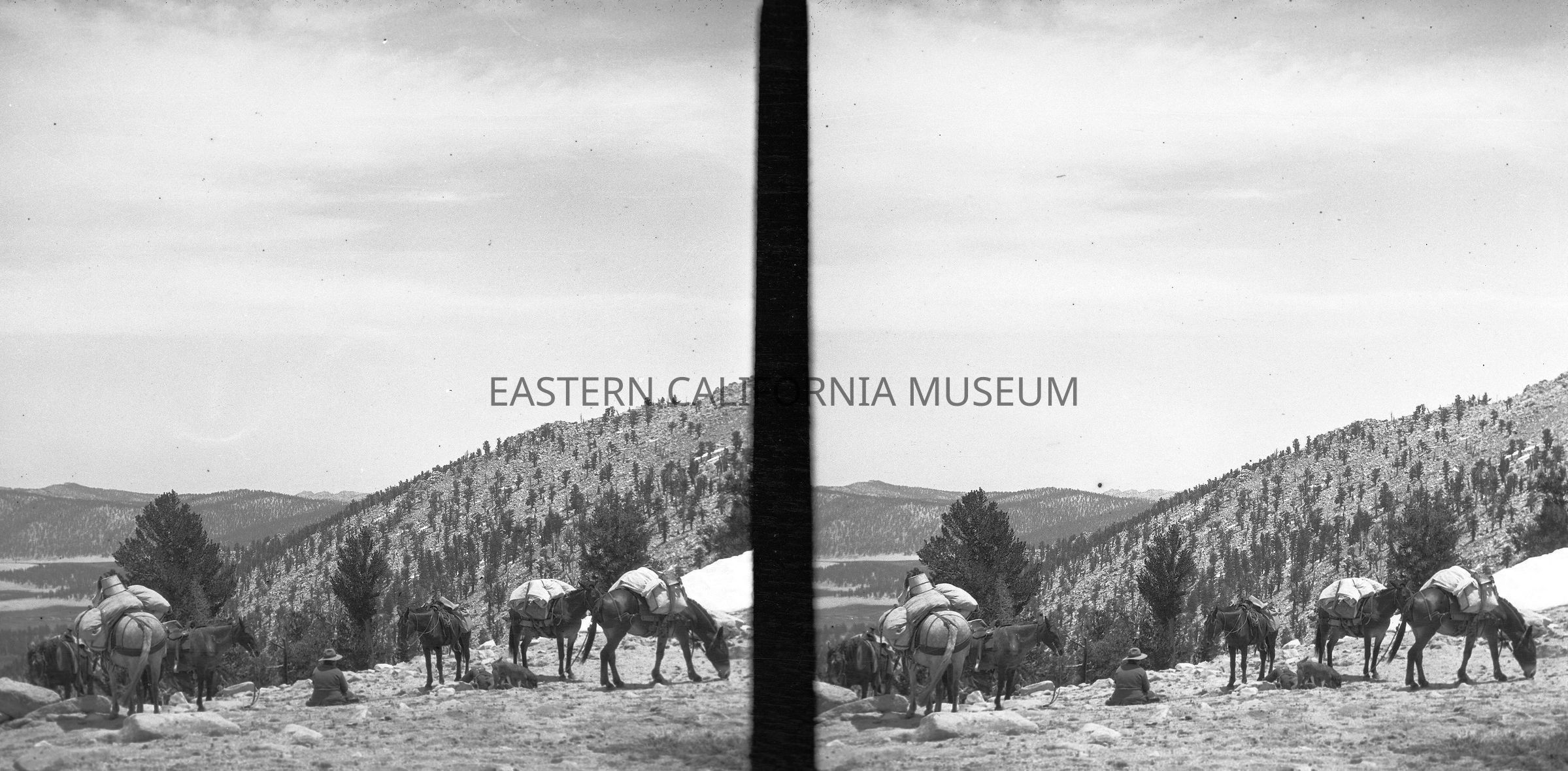 Negative of a stereoscopic image of a packtrain at rest on a mountainside looking down at the landscape.