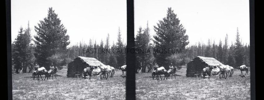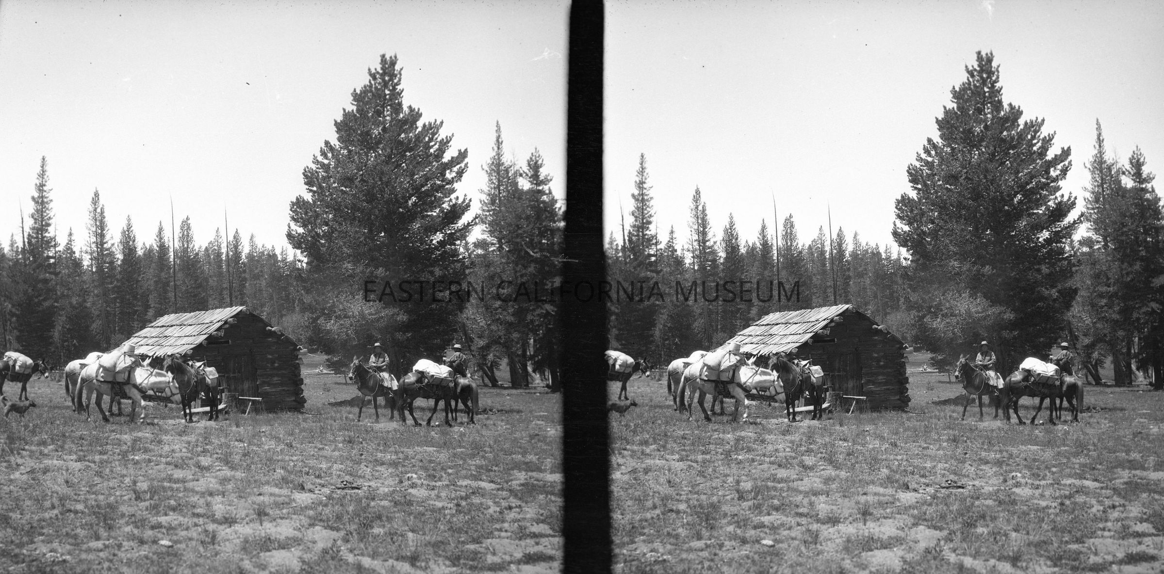 Negative of a stereoscopic image of a packtrain in front of a log cabin in a forest clearing.