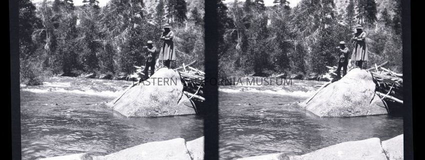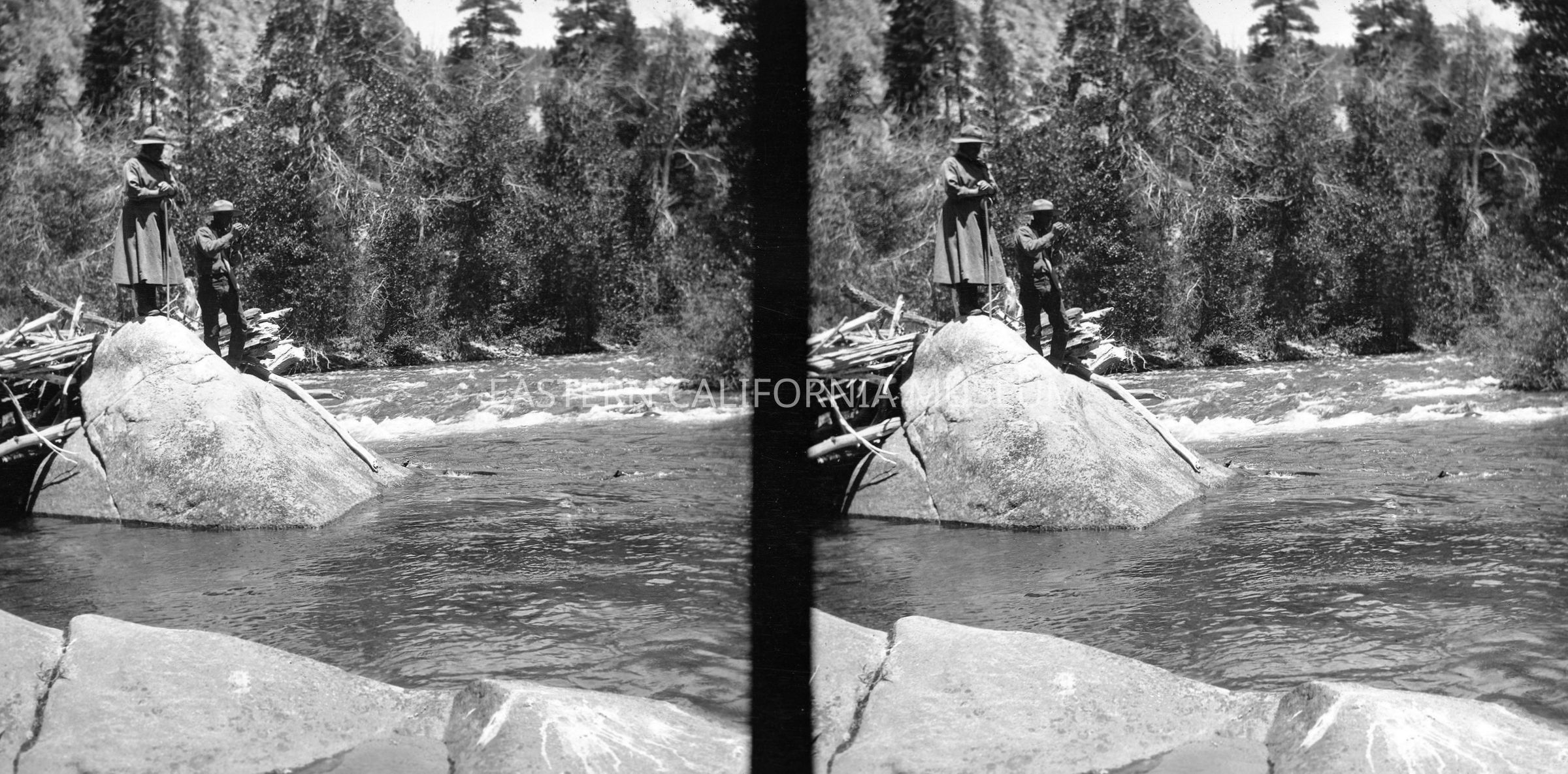Negative of a stereoscopic image of a man and woman (Matt Wolfskill and wife?) standing on a boulder in the middle of the river. The man may be taking a photo with a small hand-held camera.Made/Created