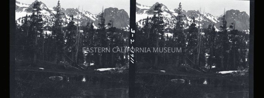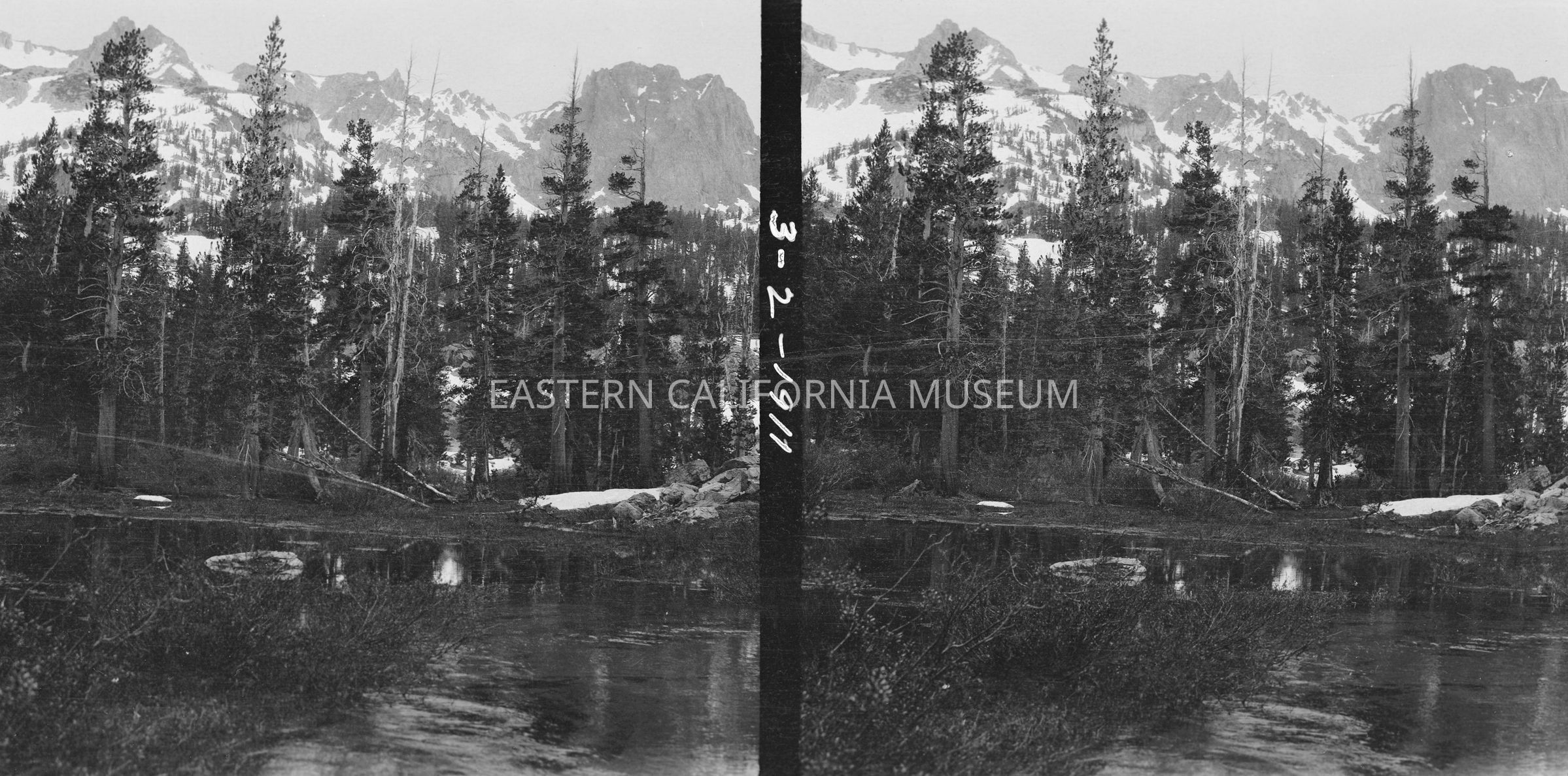 Negative of a stereoscopic image of a mountain lake surrouded by trees with snow-capped mountains in the distance.