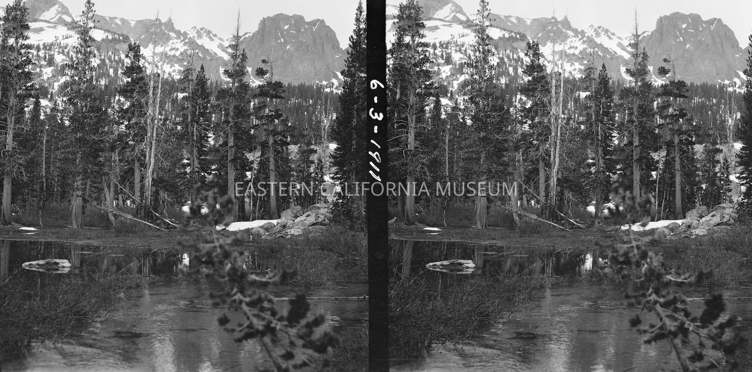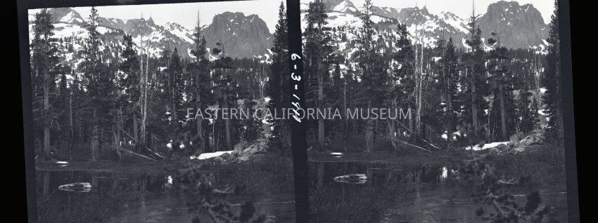 Negative of a stereoscopic image of a mountain lake surrouded by trees with snow-capped mountains in the distance. Same location as 2014.14.49.