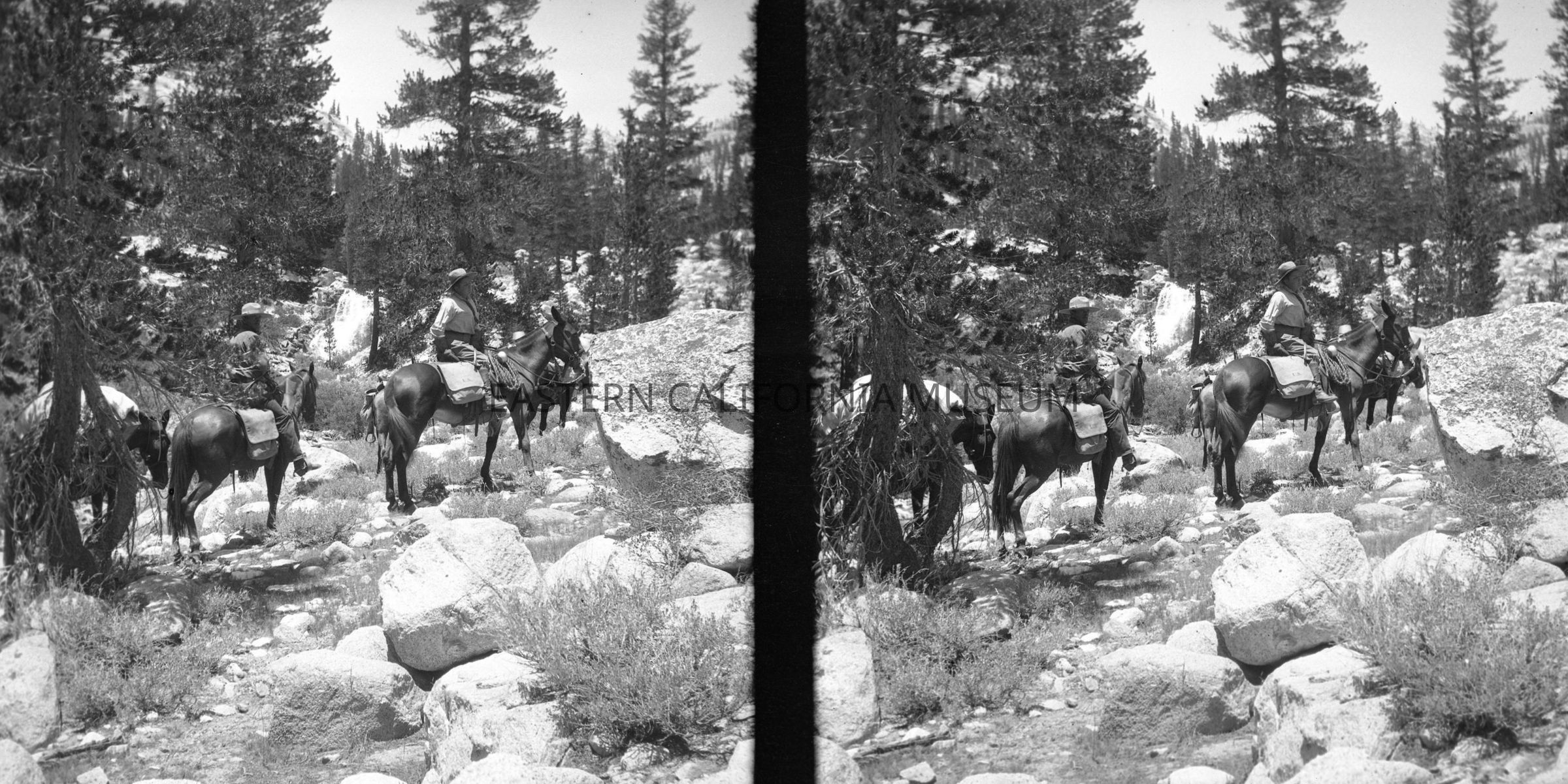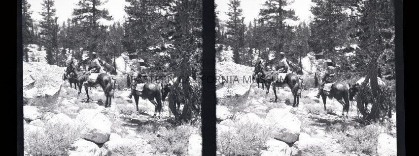 Negative of a stereoscopic image of two people on horseback with a packtrain. Lots of boulders and trees around them.