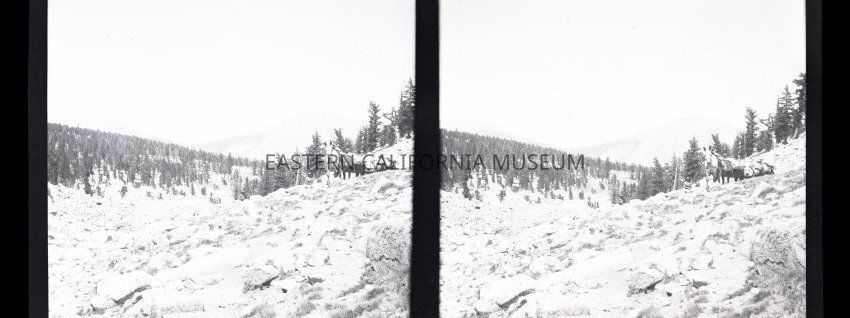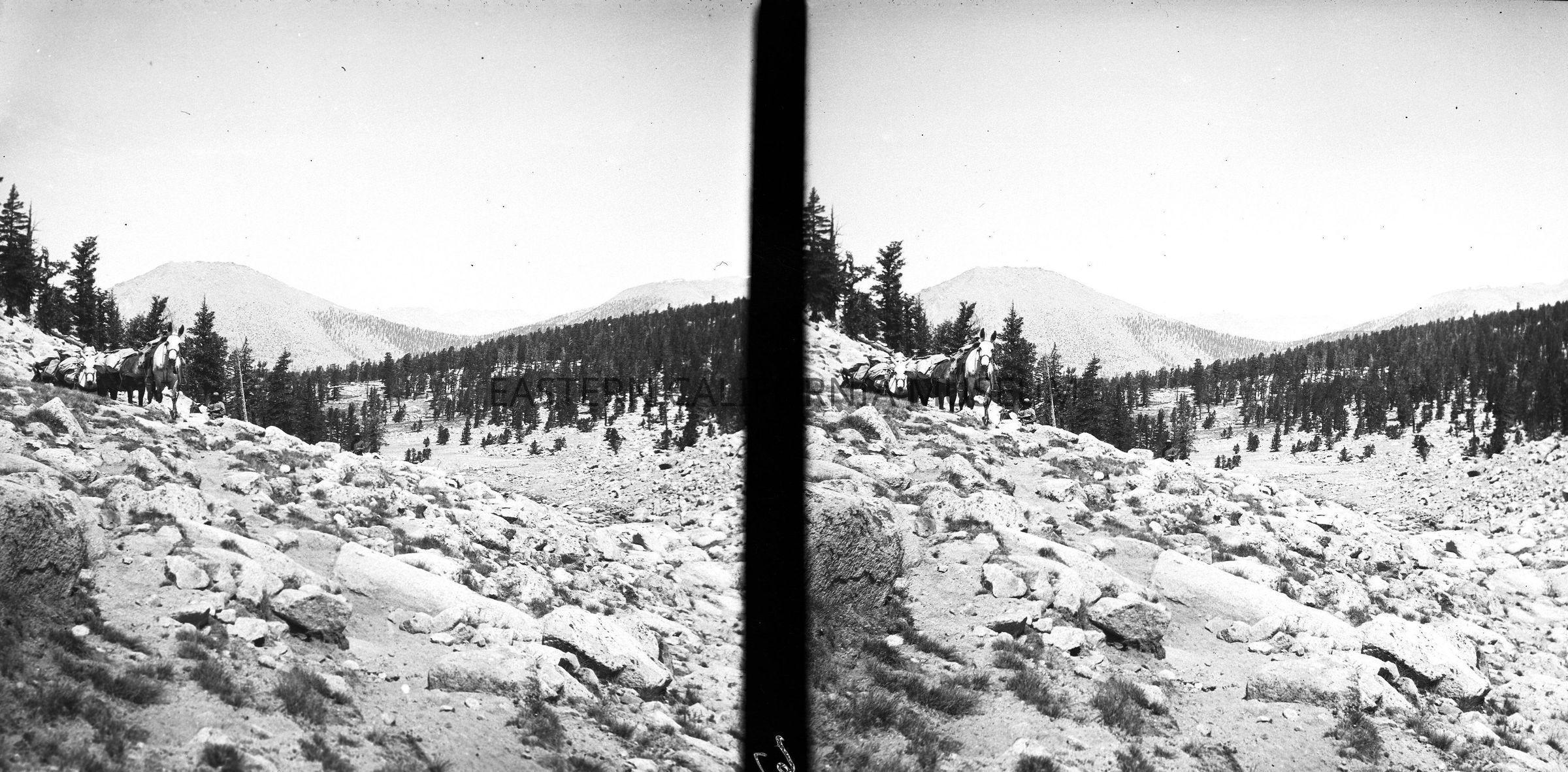 Negative of a stereoscopic image of a packtrain walking toward the cameraman in a rocky mountain landscape.