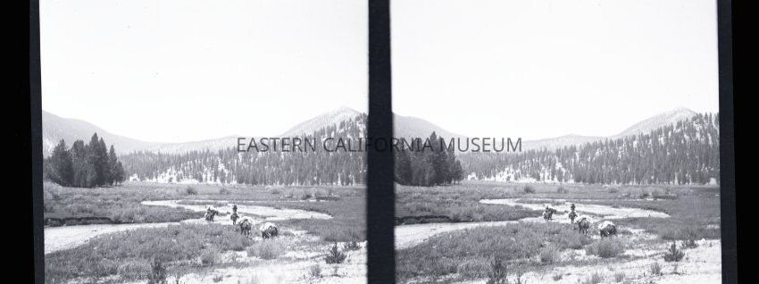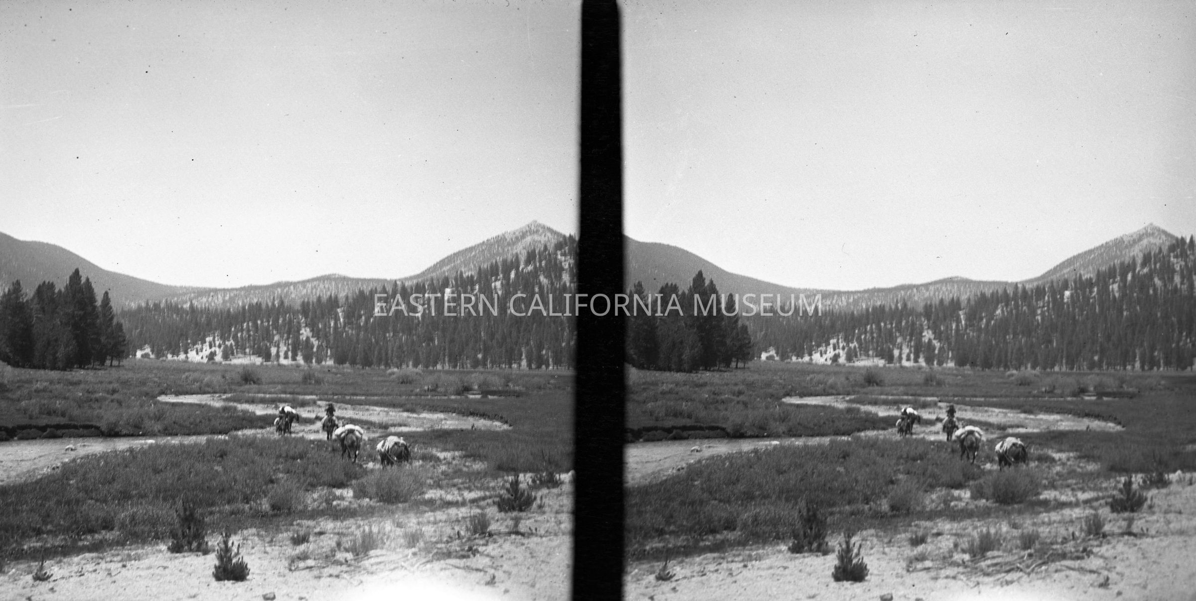Negative of a stereoscopic image of a packtrain crossing a creek in an open meadow.