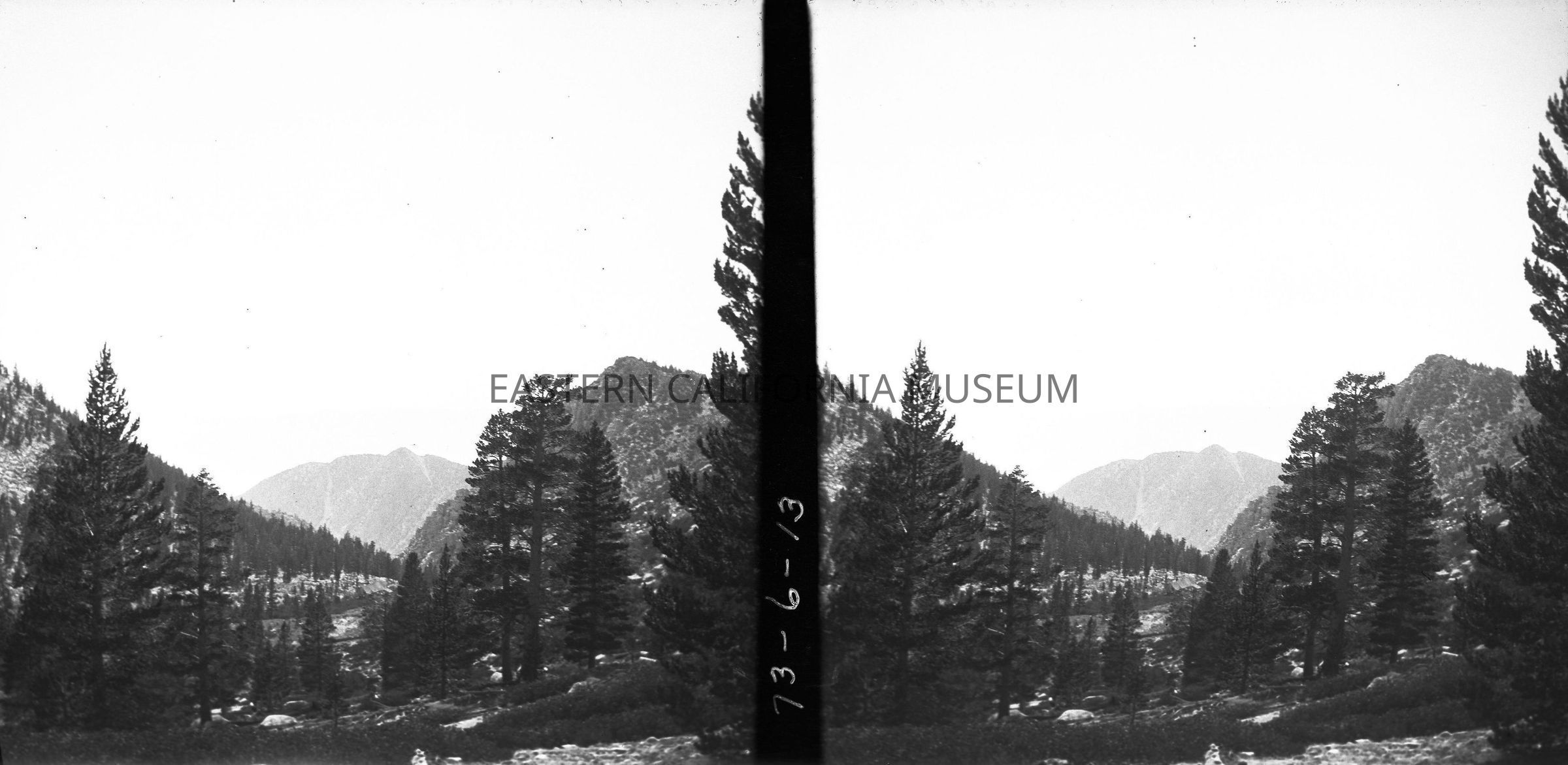 Negative of a stereoscopic image of a forested mountain landscape. Written in the middle of the two images is "73-6-13."