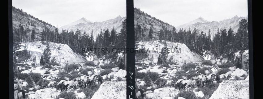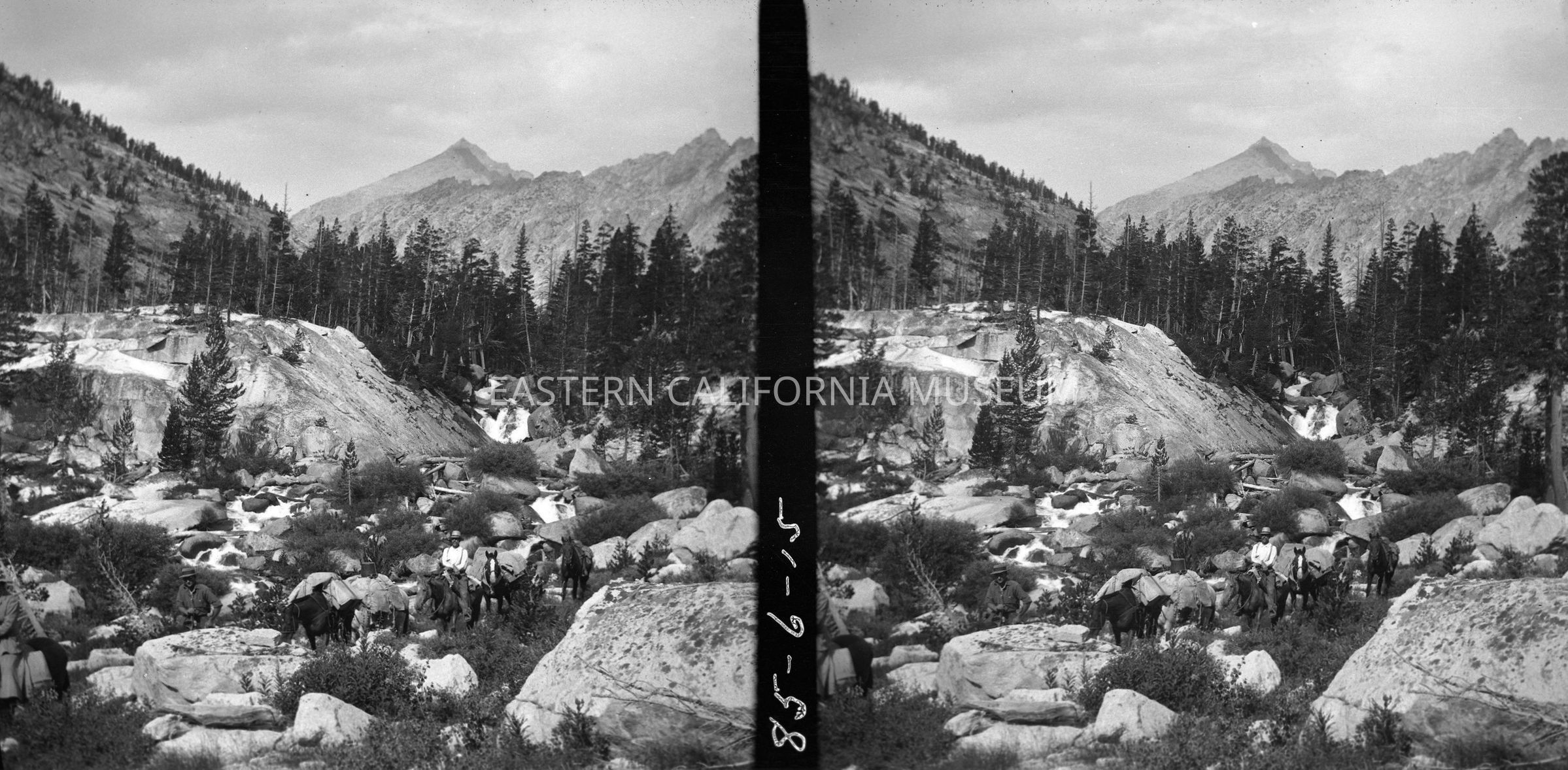 Negative of a stereoscopic image of a packtrain beside a rushing stream. The stream flows through boulders.