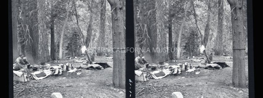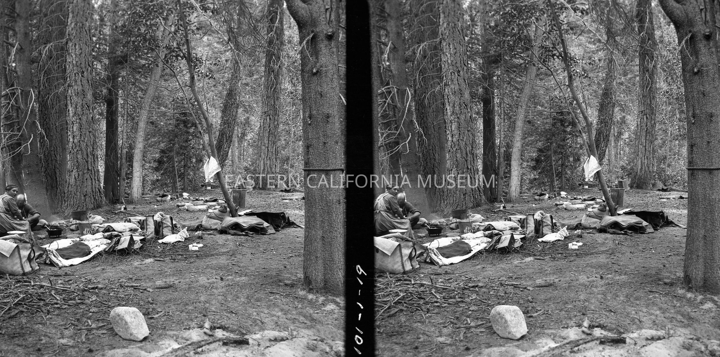 Negative of a stereoscopic image of two people in a forest campsite. Written in the middle of the two images is "101-1-19."