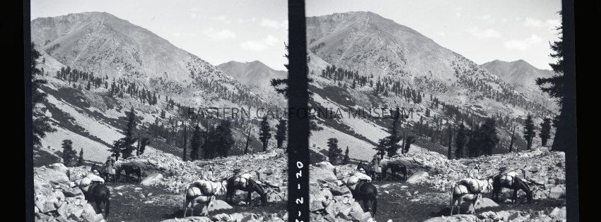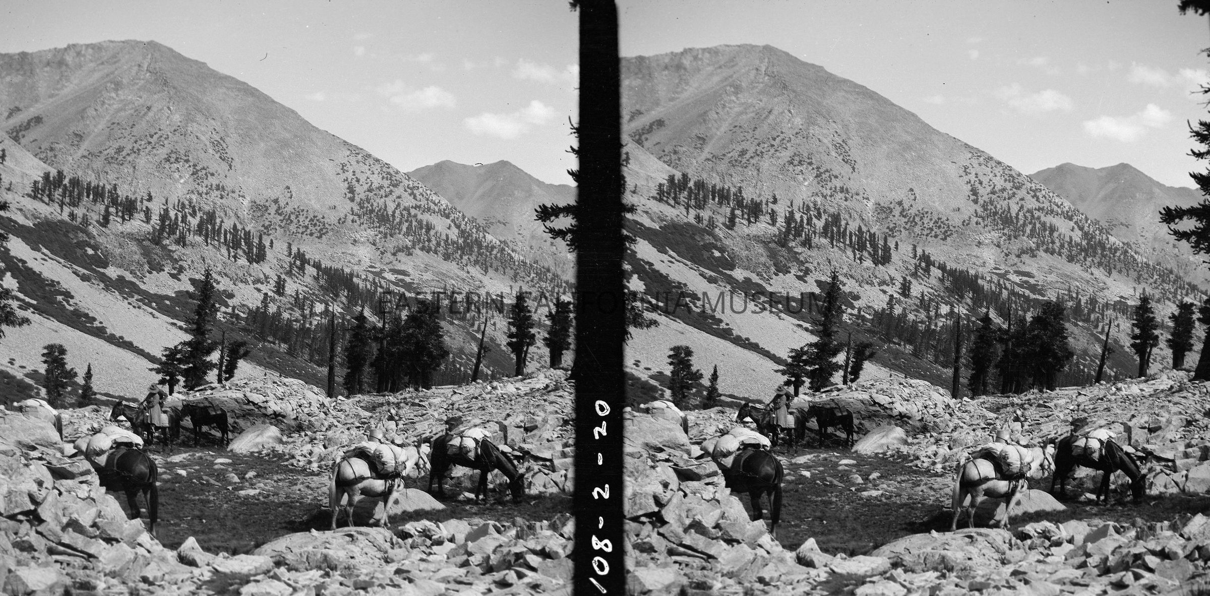 Negative of a stereoscopic image of a packtrain in a rocky mountain landscape. Written in the middle of the two images is "108-2-20."