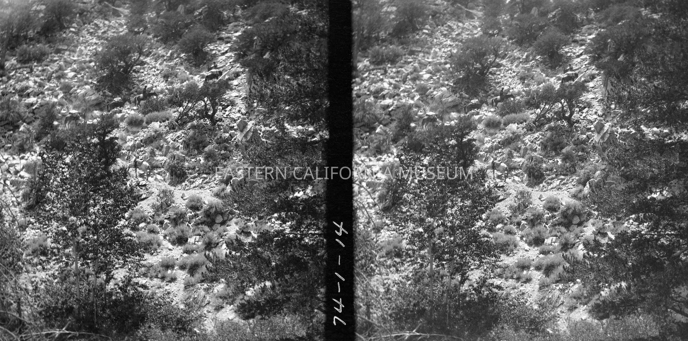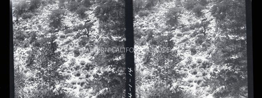 Negative of a stereoscopic image of a packtrain ascending switchbacks on a mountainside.