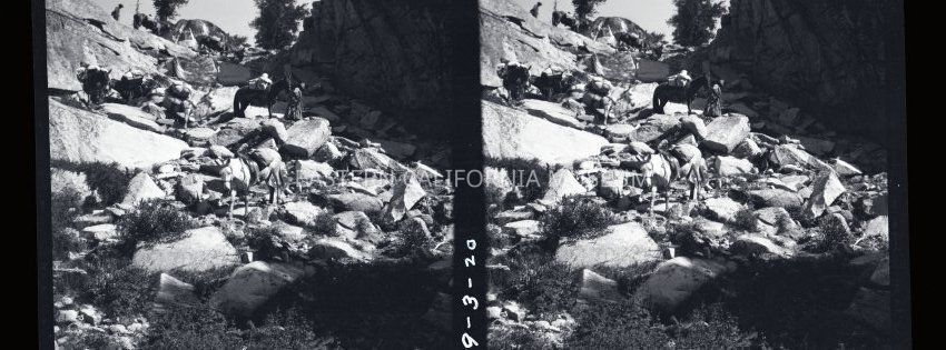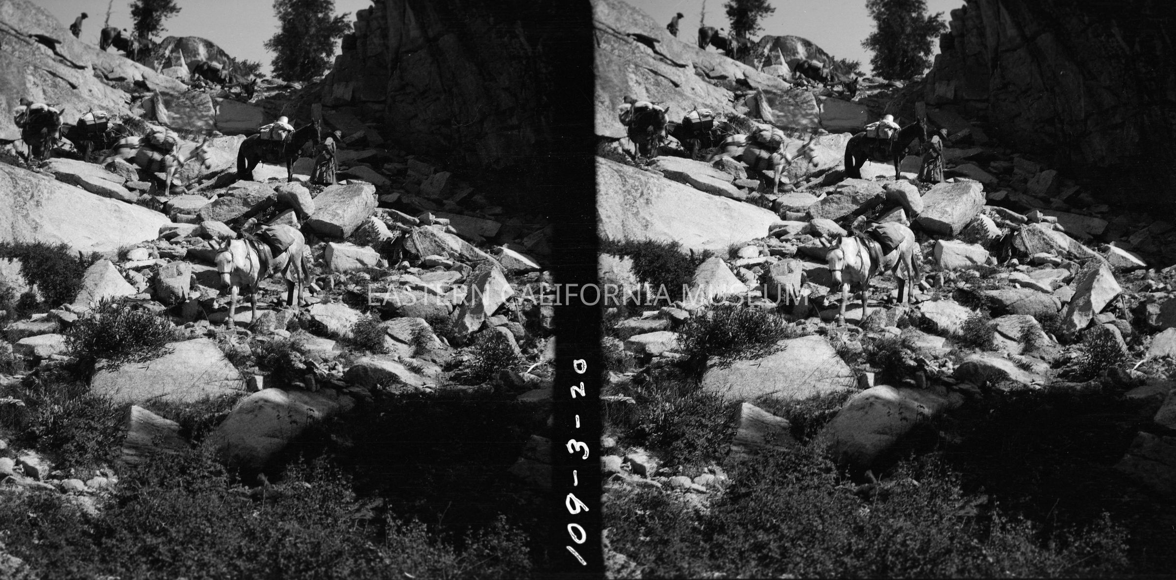 Negative of a stereoscopic image of a packtrain descending a rocky boulder-strewn route.
