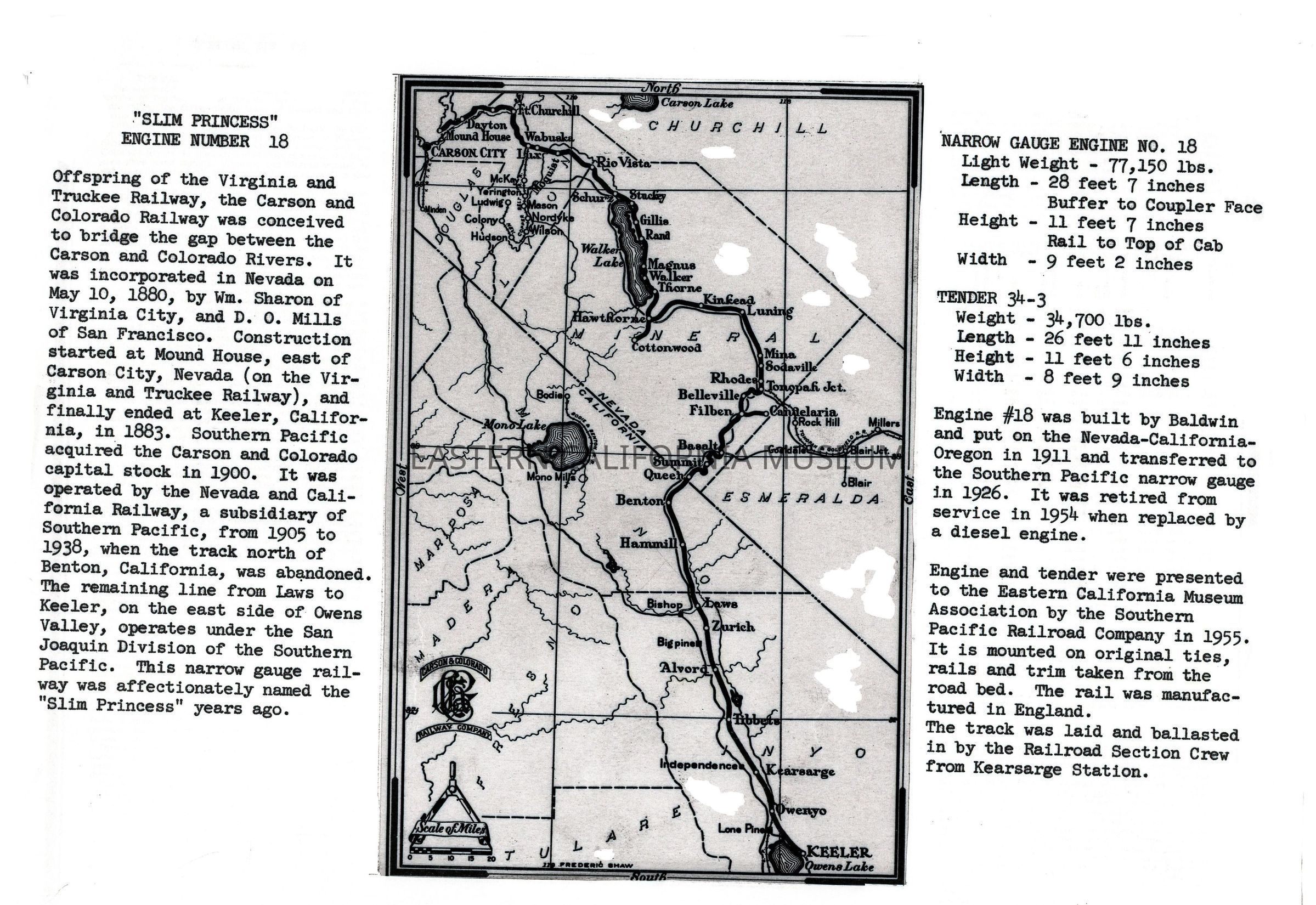 "Slim Princess" Engine Number 18. Offspring of the Virginia and Truckee Railway, the Carson and Colorado Railway was conceived to bridge the gap between the Carson and Colorado Rivers. It was incorporated in Nevada on May 10, 1880, by Wm. Sharon of Virginia City, and D. O. Mills of San Francisco. Construction started at Mound House, east of Carson City, Nevada (on the Virginia and Truckee Railway), and finally ended at Keeler, California, in 1883. Southern Pacific acquired the Carson and Colorado capital stock in 1900. It was operated by the Nevada and California Railway, a subsidiary of Southern Pacific, from 1905 to 1938, when the track north of Benton, California, was abandoned. The remaining line from Laws to Keeler, on the east side of Owens Valley, operates under the San Joaquin Division of the Southern Pacific. This narrow gauge railway was affectionately named the "Slim Princess" years ago.