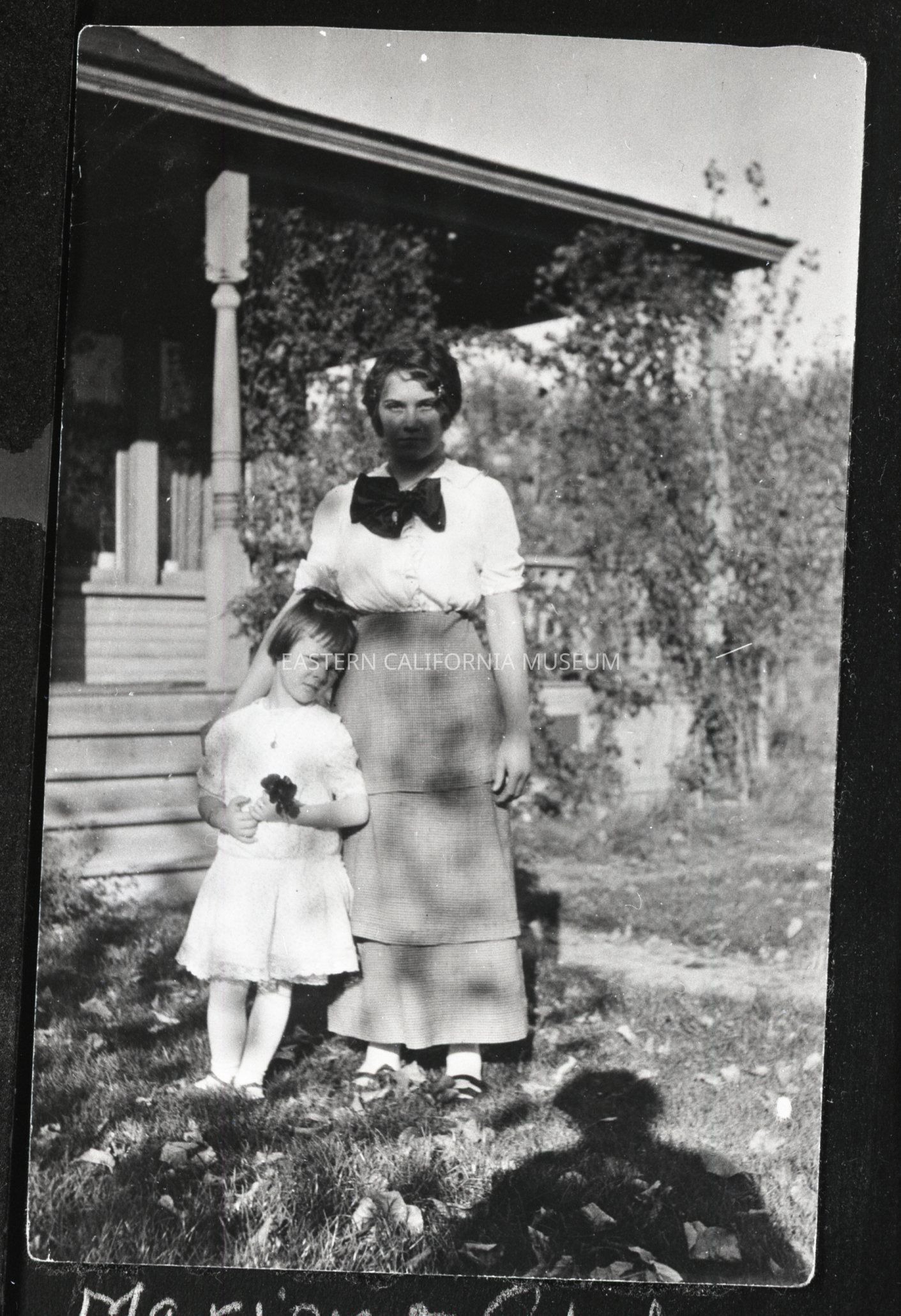 Negative of a woman and little girl identified as Marion Schivley and Gladys Jones standing in front of a house in Round Valley. It was taken circa 1914.