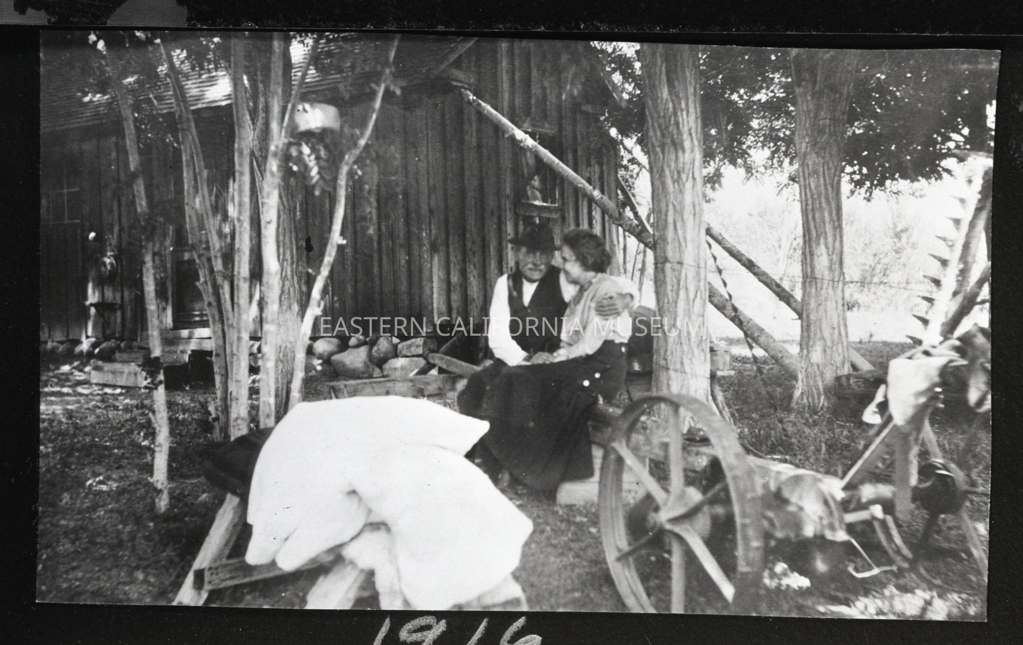 Negative of a man and woman embracing while sitting on a bench near a wooden cabin-like house. They are identified as Thomas Jones and Gladys Jones (father and daughter) at the Jones Ranch in Round Valley circa 1916.